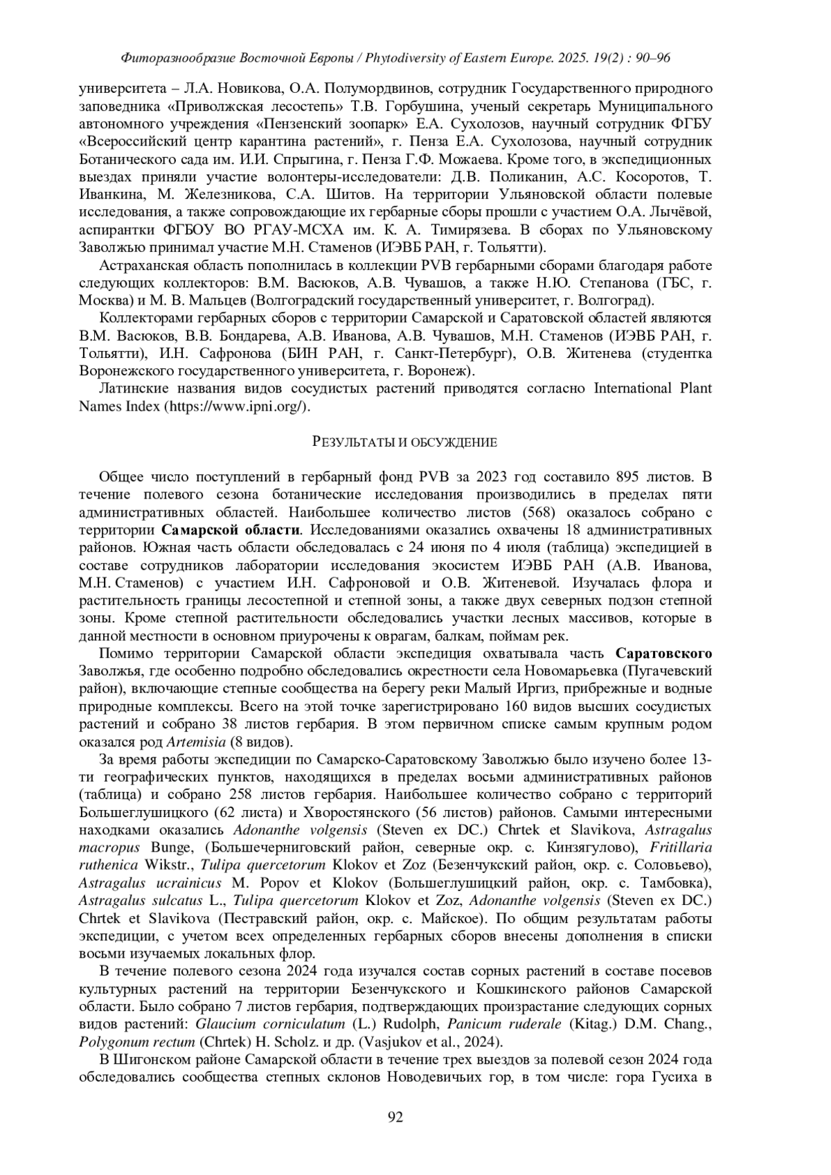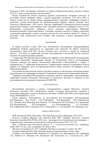 ИВАНОВА А.В. ГЕРБАРНАЯ КОЛЛЕКЦИЯ ИНСТИТУТА ЭКОЛОГИИ ВОЛЖСКОГО БАССЕЙНА РАН (PVB): ИТОГИ ПОЛЕВОГО СЕЗОНА 2024 ГОДА // ФИТОРАЗНООБРАЗИЕ ВОСТОЧНОЙ ЕВРОПЫ. 2025. Т. 19 № 2