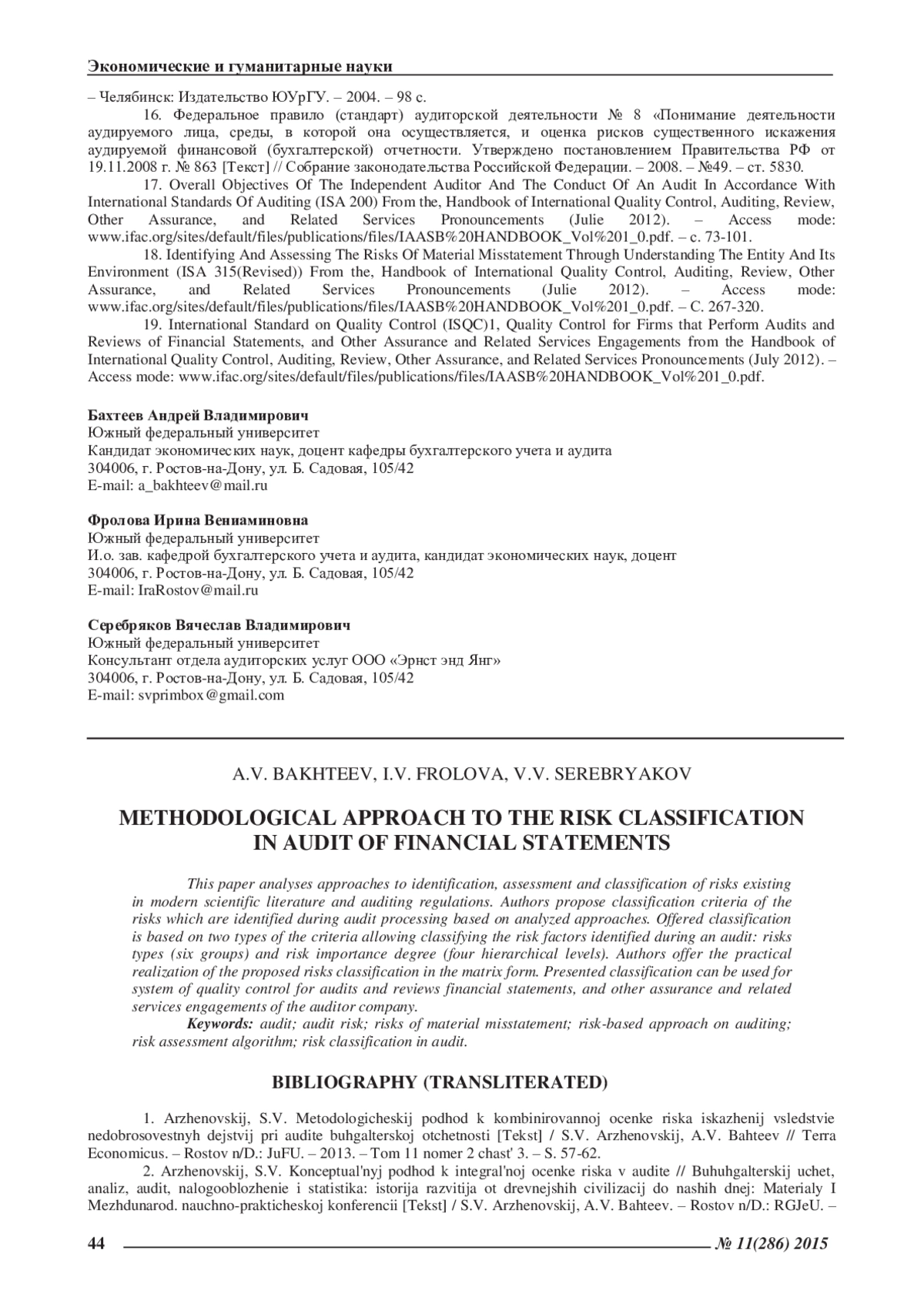 18. Identifying And Assessing The Risks Of Material Misstatement Through Understanding The Entity And Its Environment (ISA 315(Revised)) From the, Handbook of International Quality Control, Auditing, Review, Other Assurance, and Related Services Pronouncements (Julie 2012). - Access mode: www.ifac.org/sites/default/files/publications/files/IAASB HANDBOOK_Vol 1_0.pdf. - С. 267-320.