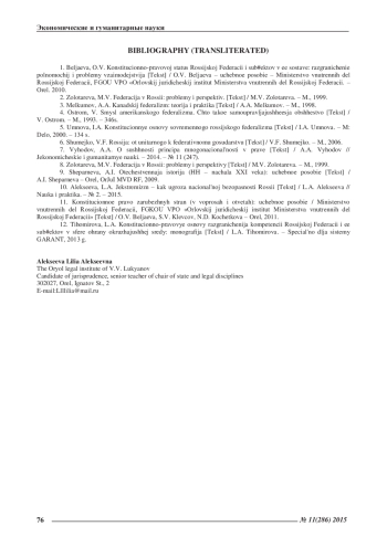 1. Беляева, О.В. Конституционно-правовой статус Российской Федерации и субъектов в ее составе: разграничение полномочий и проблемы взаимодействия [Текст] / О.В. Беляева - учебное пособие - Министерство внутренних дел Российской Федерации, ФГОУ ВПО «Орловский юридический институт Министерства внутренних дел Российской Федерации. - Орел. 2010. EDN: QRXJVD