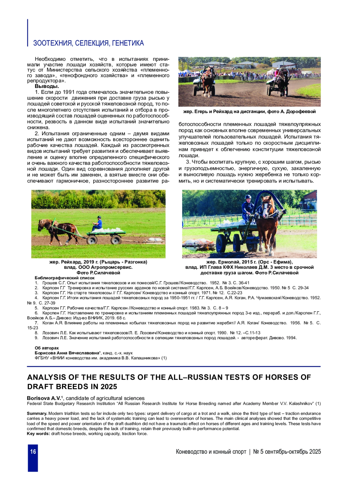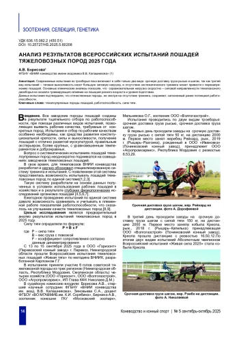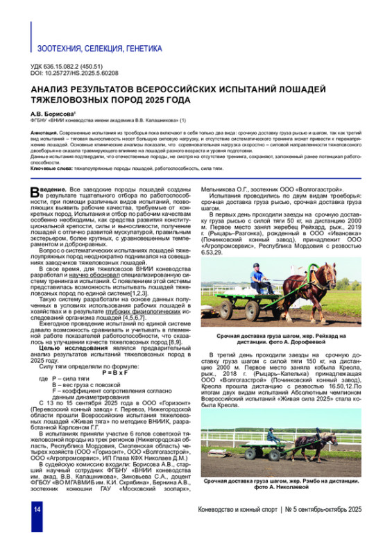 БОРИСОВА А. В. АНАЛИЗ РЕЗУЛЬТАТОВ ВСЕРОССИЙСКИХ ИСПЫТАНИЙ ЛОШАДЕЙ ТЯЖЕЛОВОЗНЫХ ПОРОД 2025 ГОДА // КОНЕВОДСТВО И КОННЫЙ СПОРТ. 2025. № 5