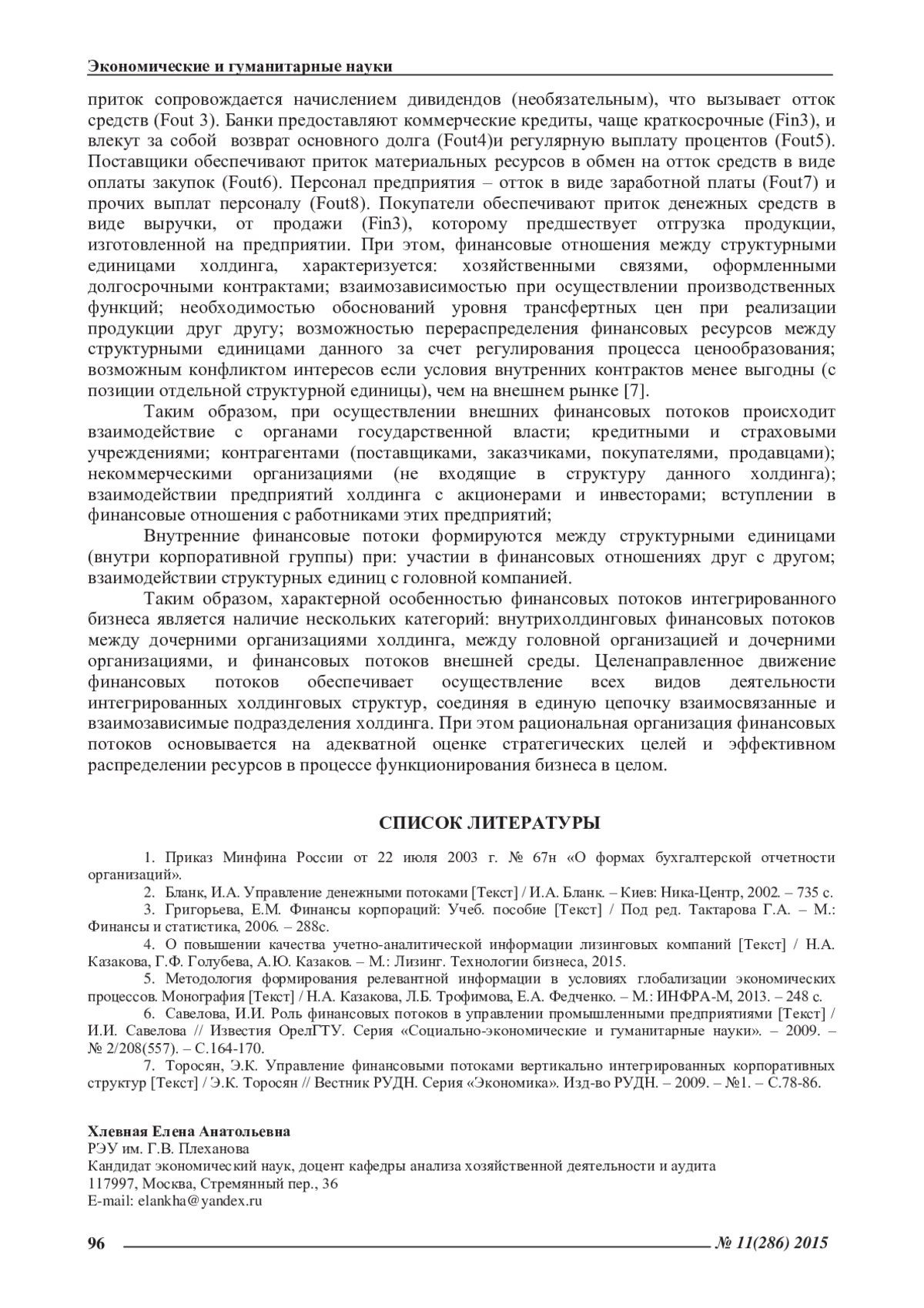 ХЛЕВНАЯ Е. А., КАЗАКОВА Н. А. ИНСТИТУЦИОНАЛЬНЫЕ ОСОБЕННОСТИ ФИНАНСОВЫХ ПОТОКОВ В ИНТЕГРИРОВАННОМ БИЗНЕСЕ // ЭКОНОМИЧЕСКИЕ И ГУМАНИТАРНЫЕ НАУКИ. 2015. № 11 (286)