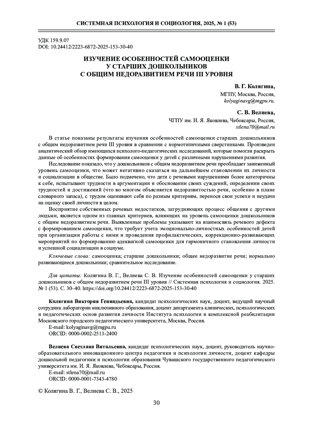 1. Валявко С. М. Анализ формирования самооценки старших дошкольников // Системная психология и социология. 2016. № 3 (19). С. 5-11. download/elibrary_27205776_50735604.pdf. EDN: WXIYHZ