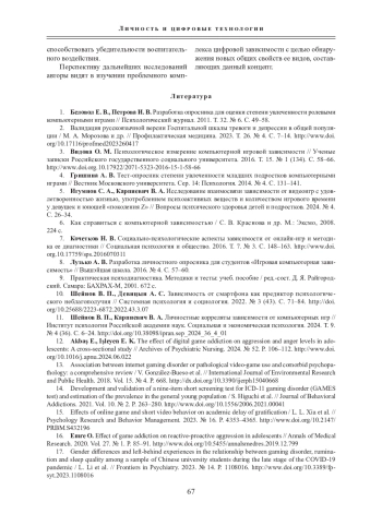 5. Игумнов С. А., Карпиевич В. А. Исследование взаимосвязи зависимости от видеоигр с удовлетворенностью жизнью, употреблением психоактивных веществ и количеством игрового времени у девушек и юношей “поколения Z” // Вопросы психического здоровья детей и подростков. 2024. № 4. С. 26-34. EDN: NUGLYM