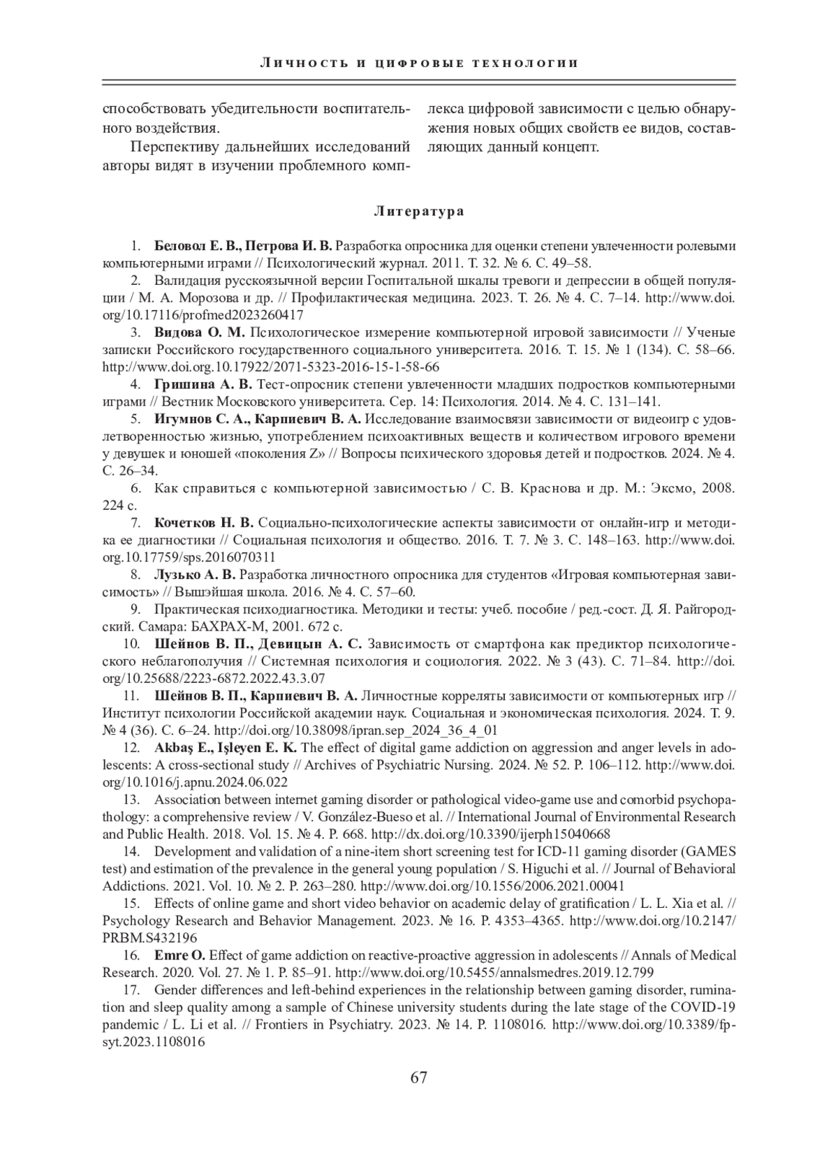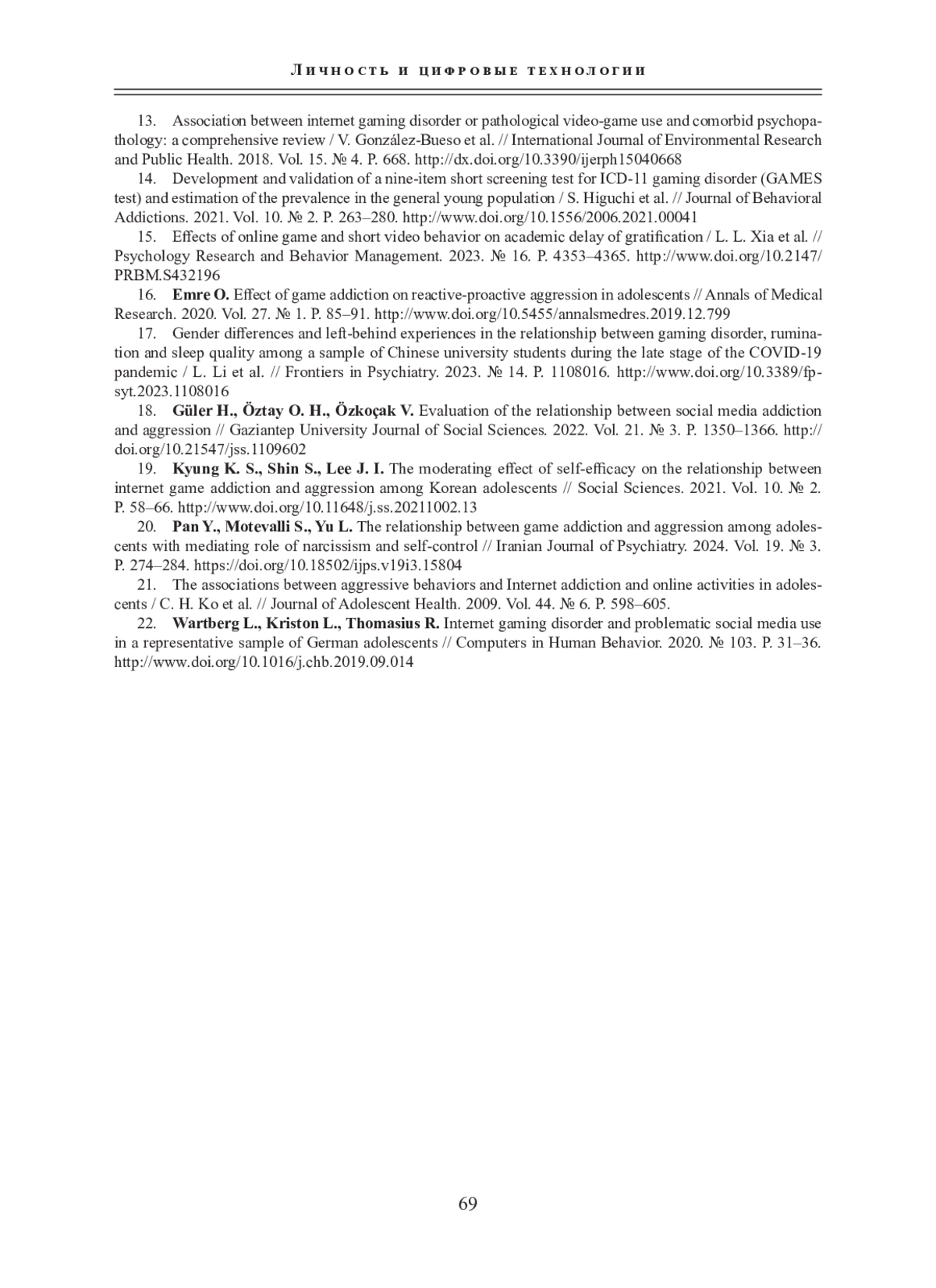 12. Akbaş E., Işleyen E. K. The effect of digital game addiction on aggression and anger levels in adolescents: A cross-sectional study // Archives of Psychiatric Nursing. 2024. № 52. P. 106-112. http://www. DOI: 10.1016/j.apnu.2024.06.022 EDN: WZICJI