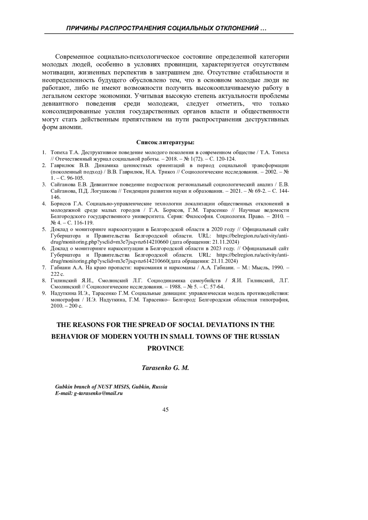 9. Надуткина И.Э., Тарасенко Г.М. Социальные девиации: управленческая модель противодействия: монография / И.Э. Надуткина, Г.М. Тарасенко- Белгород: Белгородская областная типография, 2010. - 200 с.