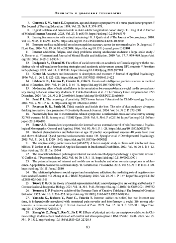Интернет-зависимость становится все более распространенной пробле мой, затрагивающей людей разных возрастов и социальных групп. Несмотря на то что существует множество исследований интернет-зависимости, понимание психологических факторов, предрасполагающих к ее развитию, остается неполным. Избыточное использование Интернета вызывает усталость [11], головную боль [23], снижение способности к произвольному самоконтролю поведения и эмоций [24] и такие проблемы психического здоровья, как депрессия и тревожность [22].