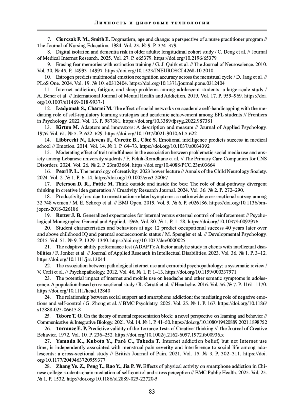 28. Zhang Ye. Z., Peng T., Rao Y., Jia P. W. Effects of physical activity on smartphone addiction in Chinese college students-chain mediation of self-control and stress perception // BMC Public Health. 2025. Vol. 25. № 1. P. 1532. DOI: 10.1186/s12889-025-22720-5