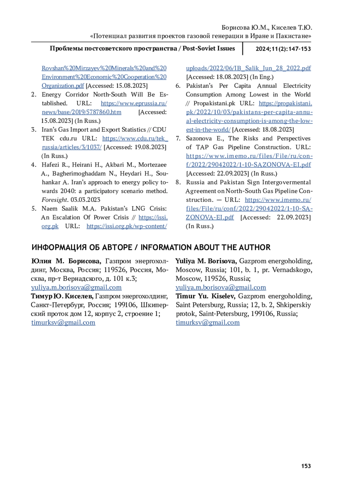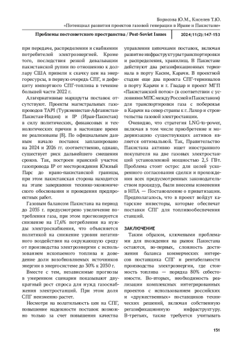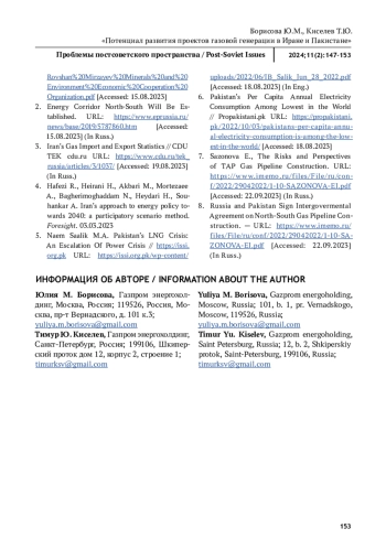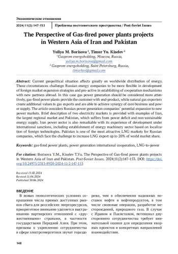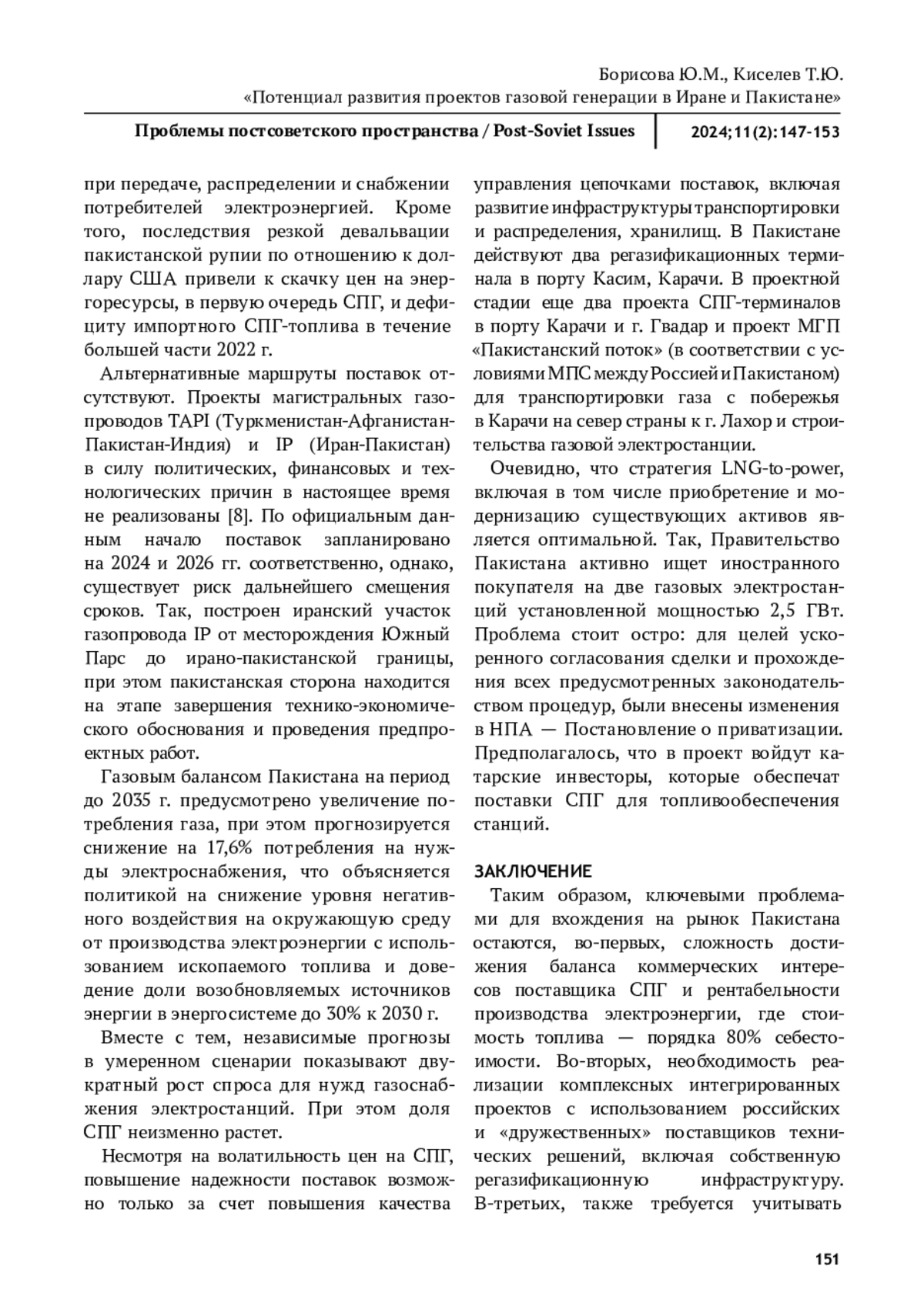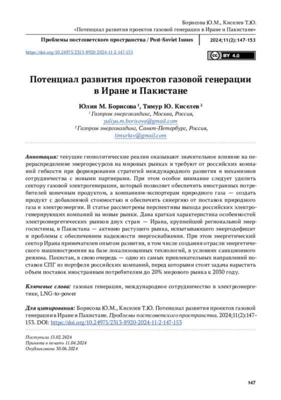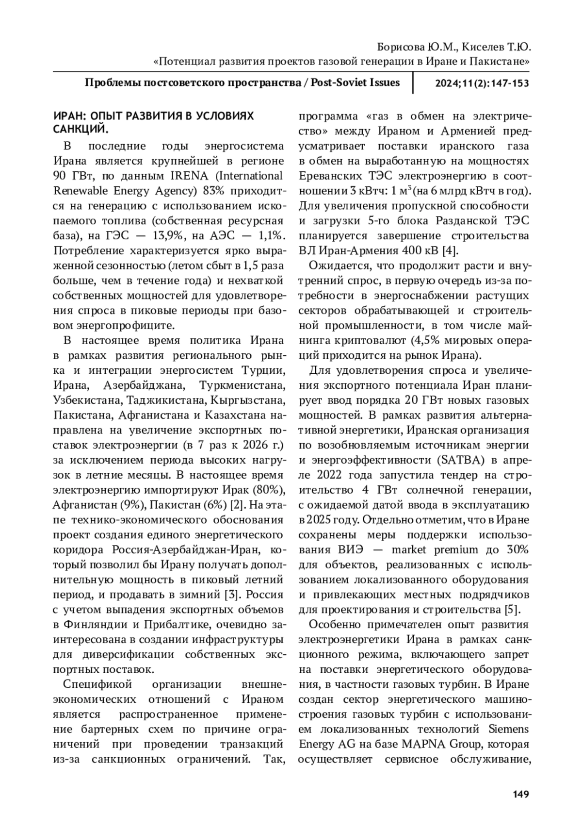 БОРИСОВА Ю. М., КИСЕЛЕВ Т. Ю. ПОТЕНЦИАЛ РАЗВИТИЯ ПРОЕКТОВ ГАЗОВОЙ ГЕНЕРАЦИИ В ИРАНЕ И ПАКИСТАНЕ // ПРОБЛЕМЫ ПОСТСОВЕТСКОГО ПРОСТРАНСТВА. 2025. ТОМ 11, № 2