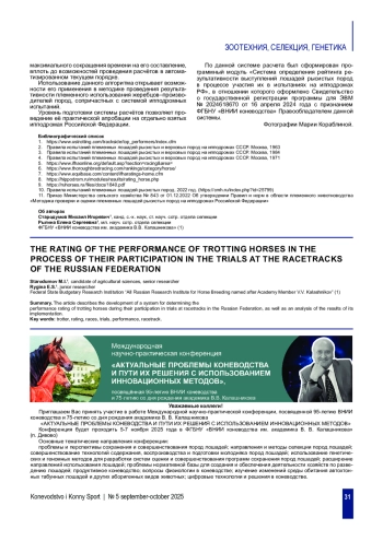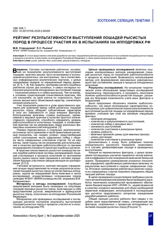 ведение. Система составления рейтингов, основанная на показателях результативности выступлений лошадей, практика весьма часто встречаемая и используемая на различных, как иностранных, так и отечественных информационно-аналитических порталах, с целью определения лидеров за определенный период времени. [5, 6, 7, 8]. Как правило, критерием расчета подобных рейтингов служат два основных, и самых наглядных показателя результатов ипподромных выступлений лошади - показанная резвость и сумма выигрыша. Тем не менее, в условиях существующей отечественной практики, оба эти показателя, на деле взятые по отдельности, будут носить весьма мало объективный характер, значительно искажая реальность.