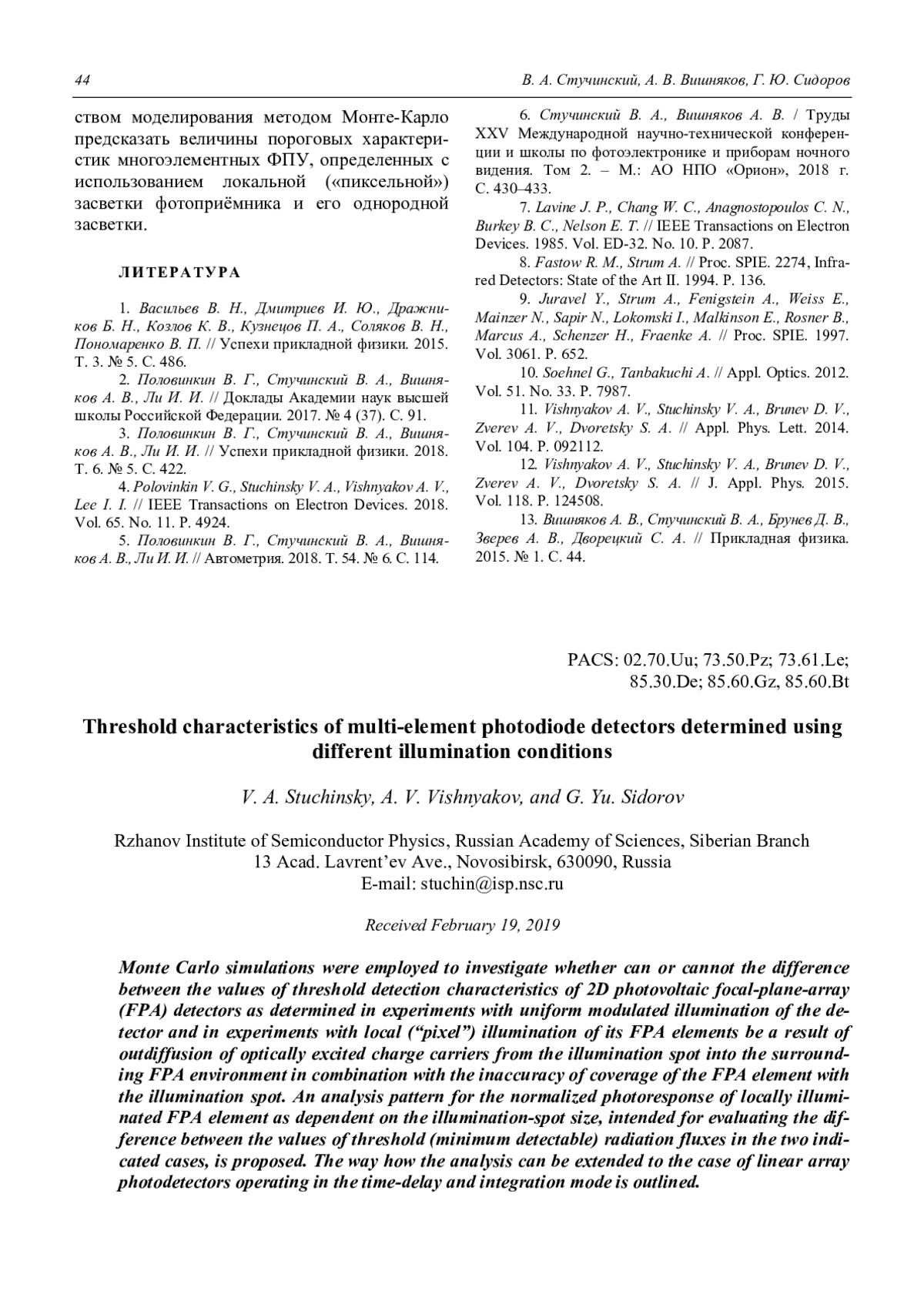 6. V. A. Stuchinsky and A. V. Vishnyakov, in Proc. of the XXV International Scientific-Technical Conference on Photoelectronics and Night Viewers in 2 volumes. Volume 2. – Moscow: R&D Orion Association, 2018, pp. 430–433.