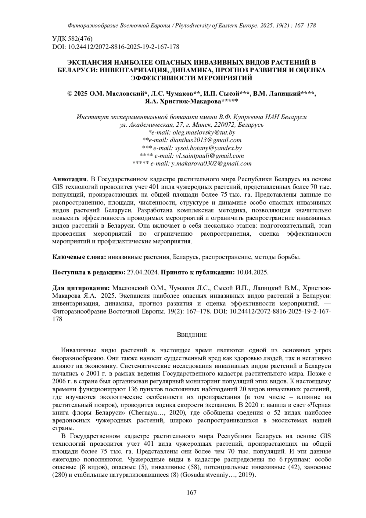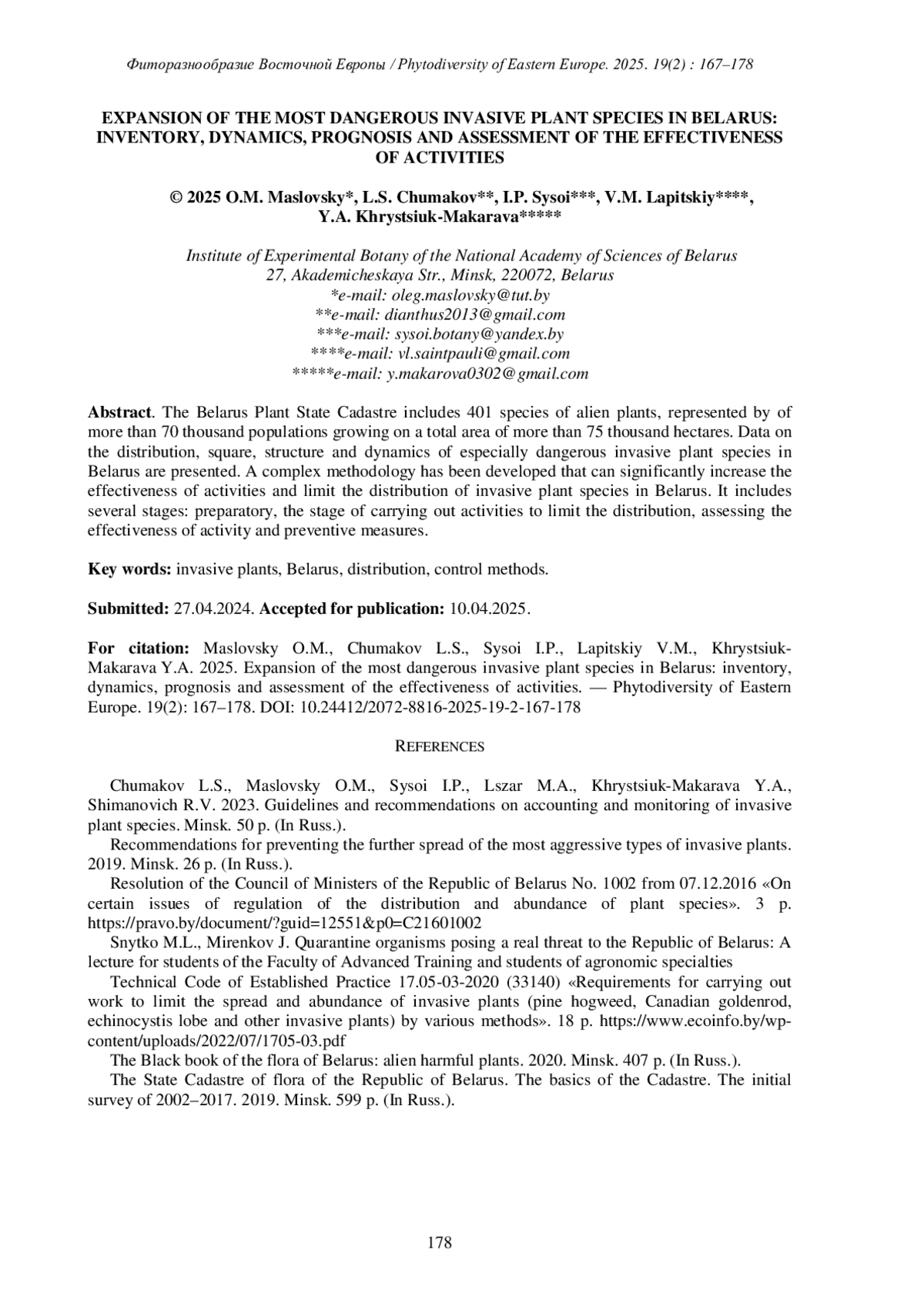 МАСЛОВСКИЙ О.М., ЧУМАКОВ Л.С., СЫСОЙ И.П., ЛАПИЦКИЙ В.М., ХРИСТЮК-МАКАРОВА Я.А. ЭКСПАНСИЯ НАИБОЛЕЕ ОПАСНЫХ ИНВАЗИВНЫХ ВИДОВ РАСТЕНИЙ В БЕЛАРУСИ: ИНВЕНТАРИЗАЦИЯ, ДИНАМИКА, ПРОГНОЗ РАЗВИТИЯ И ОЦЕНКА ЭФФЕКТИВНОСТИ МЕРОПРИЯТИЙ // ФИТОРАЗНООБРАЗИЕ ВОСТОЧНОЙ ЕВРОПЫ. 2025. Т. 19 № 2