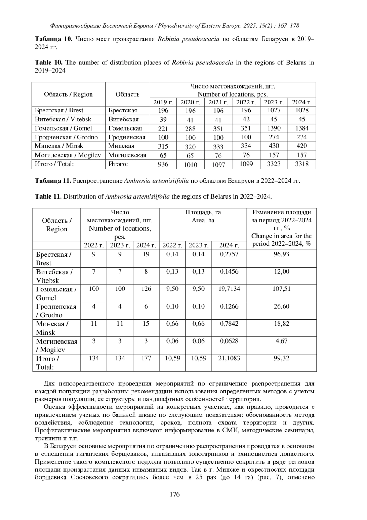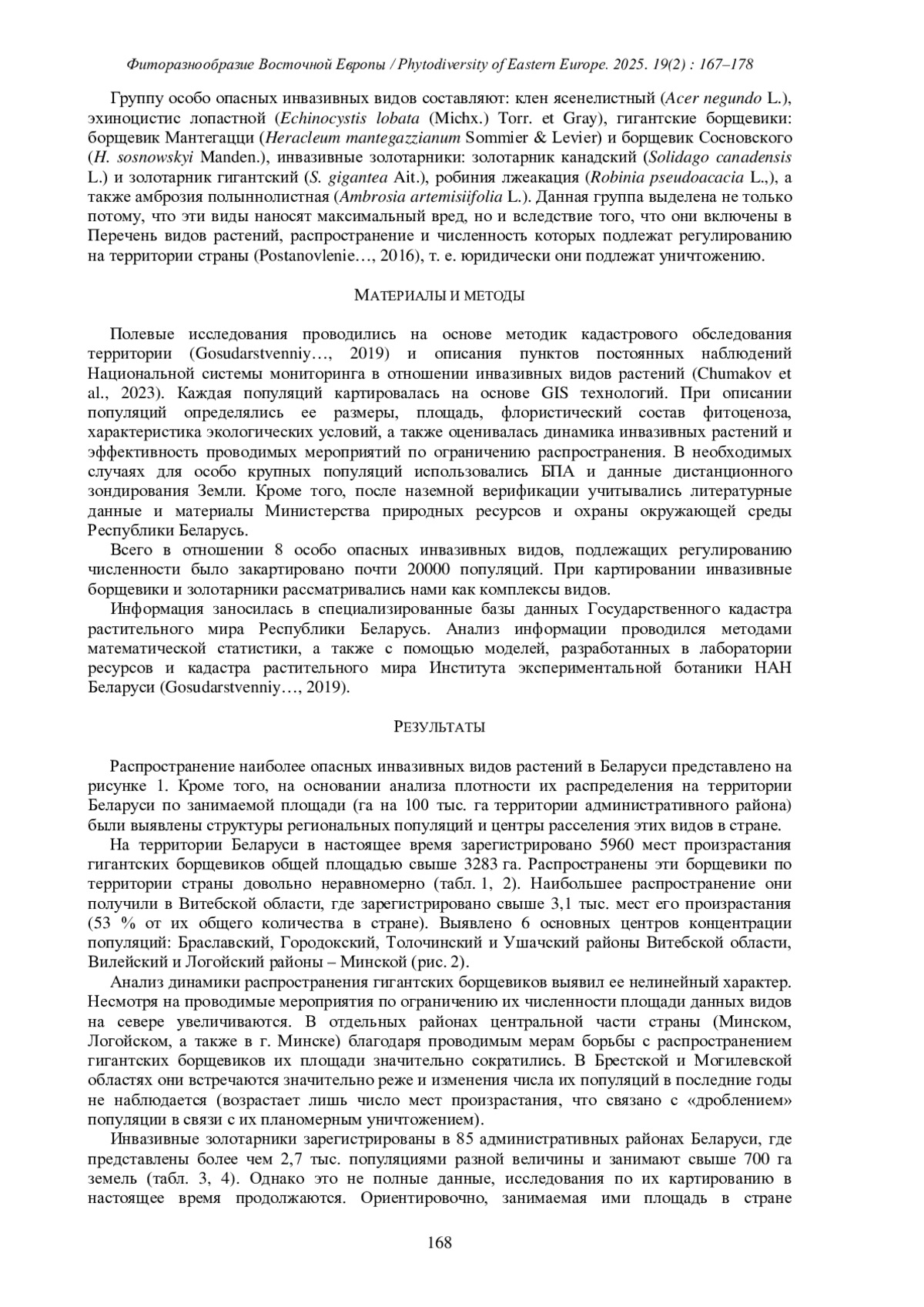 Статья: ЭКСПАНСИЯ НАИБОЛЕЕ ОПАСНЫХ ИНВАЗИВНЫХ ВИДОВ РАСТЕНИЙ В БЕЛАРУСИ: ИНВЕНТАРИЗАЦИЯ, ДИНАМИКА, ПРОГНОЗ РАЗВИТИЯ И ОЦЕНКА ЭФФЕКТИВНОСТИ МЕРОПРИЯТИЙ (2025)
