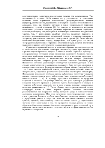 14. Li R. Do changes in coping style explain the effectiveness of interventions for psychological morbidity in family carers of people with dementia? A systematic review and meta-analysis / R. Li, C. Cooper, A. Austin, G. Livingston // Int. Psychogeriatr. - 2013. - Vol. 25, №2. - P. 204-214.