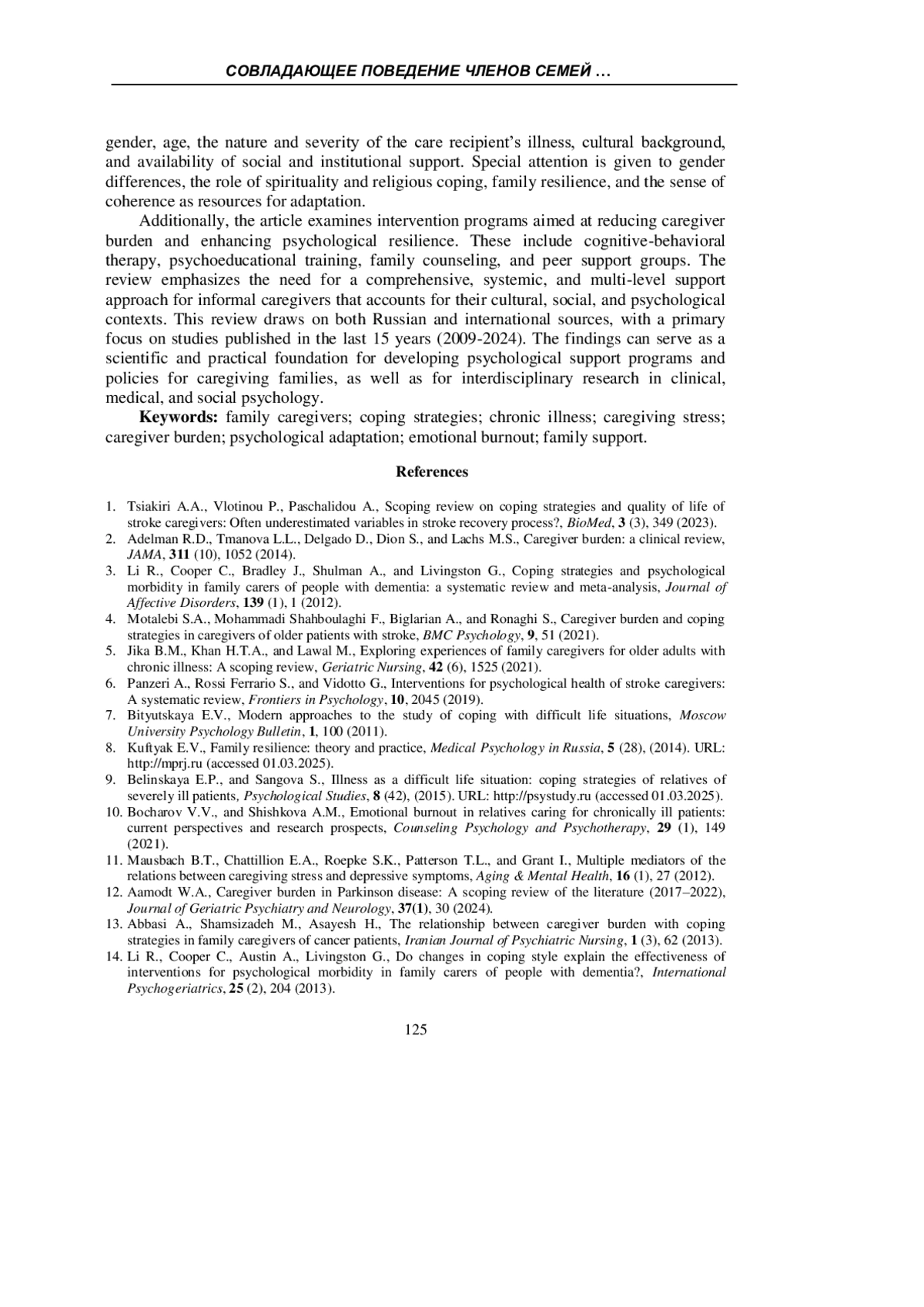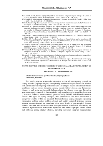 Статья представляет теоретический обзор современных исследований, посвящённых совладающему поведению членов семей, ухаживающих за близкими с хроническими заболеваниями, требующими постоянного ухода (инсульт, деменция, онкология и др.). Рассматриваются ключевые подходы к копингу: когнитивно-поведенческий, стресс-ориентированный и системно-семейный. Проанализированы типичные стратегии совладания у семейных опекунов, их связь с психологическим благополучием, а также факторы, влияющие на выбор копинга: характер заболевания, культура, социальная поддержка и личностные ресурсы. Отмечено, что проблемно-ориентированные и социально направленные стратегии связаны с более низким уровнем дистресса, тогда как избегание и отрицание - с эмоциональным выгоранием и депрессией. Рассматриваются методы психологической помощи ухаживающим: тренинги копинга, семейное консультирование, когнитивно-поведенческая терапия. Обзор опирается на русскоязычные и зарубежные источники последних 15 лет.