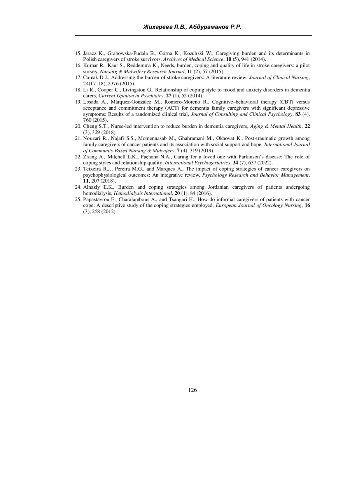 15. Jaracz K. Caregiving burden and its determinants in Polish caregivers of stroke survivors / K. Jaracz, B. Grabowska-Fudala, K. Górna, W. Kozubski // Arch. Med. Sci. - 2014. - Vol. 10, № 5. - P. 941-950.