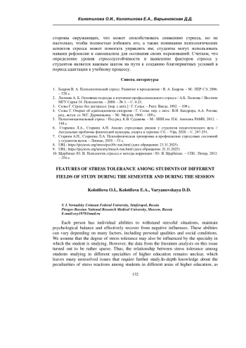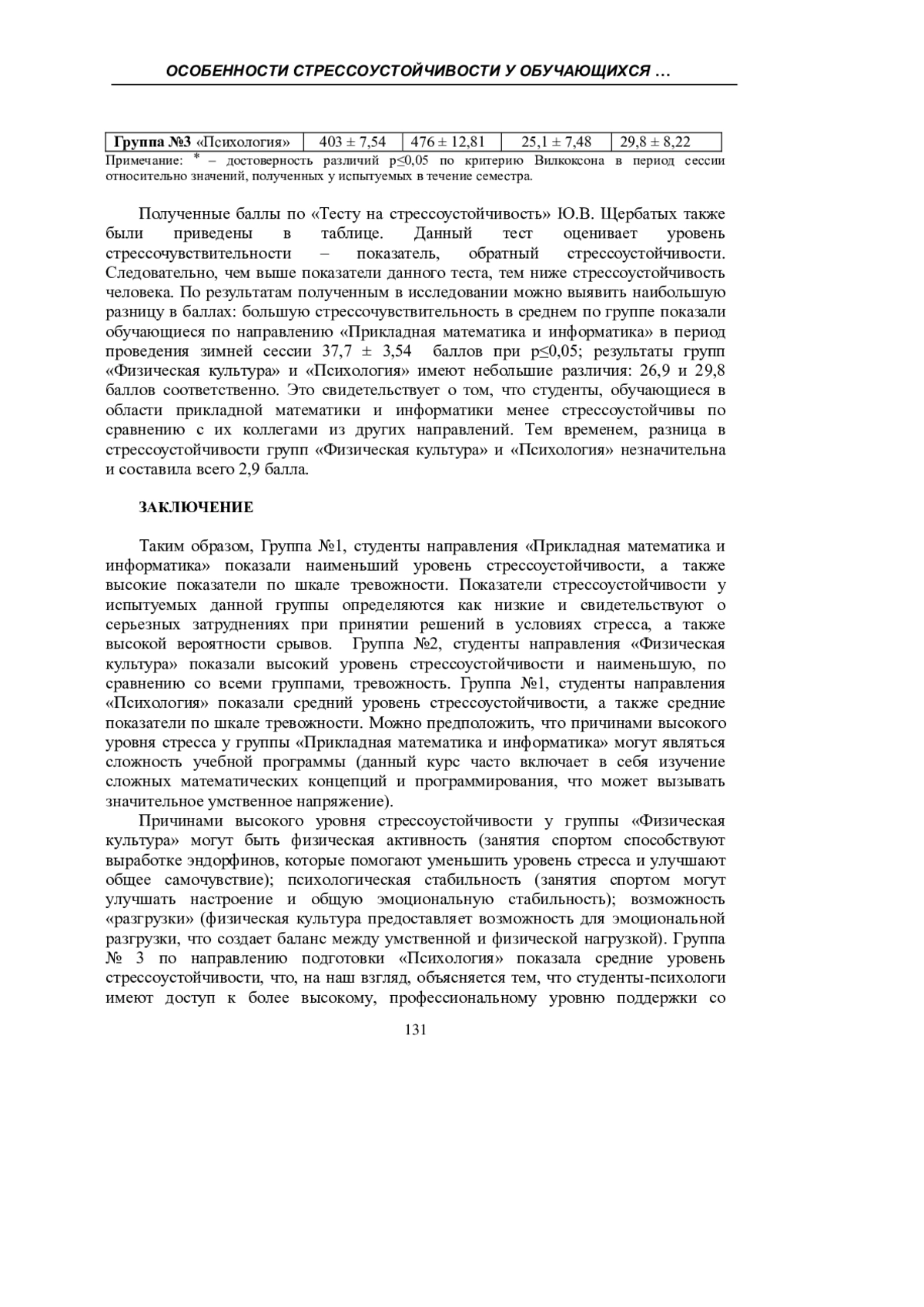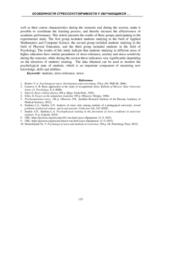 Углубленные знания о протекании стрессовых реакций у обучающихся на разных направлениях подготовки в ВУЗе, а также их особенности проявления во время обучения в семестре, и во время сессии позволяют скоординировать обучающий процесс, и тем самым повысить результативность успеваемости. В связи с этим было проведено исследование, в котором участвующих в нем студентов поделили на три группы, в зависимости от их специальности обучения. В первую группу вошли студенты, обучающиеся по направлению подготовки «Прикладная математика и информатика», во вторую - обучающиеся по специальности «Физическая культура», и третью составили студенты направления «Психология». Анализ полученных результатов свидетельствует о том, что студенты, обучающиеся на разных направлениях в ВУЗе, в течение семестра имеют сходные проявления стрессоустойчивости, тревожности и стрессочувствительности, в то время, как в период сессии эти показатели значительно различаются в зависимости от направления подготовки обучения.