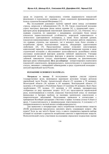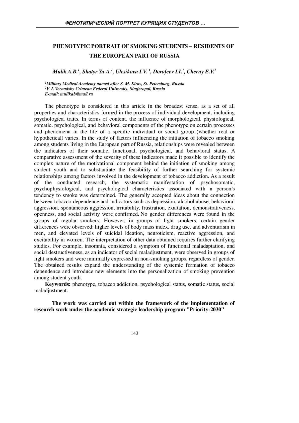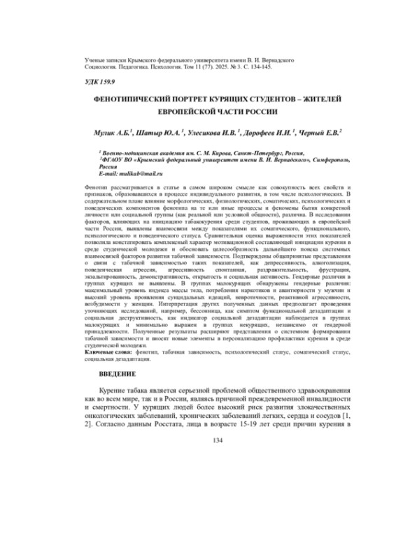 Фенотип рассматривается в статье в самом широком смысле как совокупность всех свойств и признаков, образовавшихся в процессе индивидуального развития, в том числе психологических. В содержательном плане влияние морфологических, физиологических, соматических, психологических и поведенческих компонентов фенотипа на те или иные процессы и феномены бытия конкретной личности или социальной группы (как реальной или условной общности), различна. В исследовании факторов, влияющих на инициацию табакокурения среди студентов, проживающих в европейской части России, выявлены взаимосвязи между показателями их соматического, функционального, психологического и поведенческого статуса. Сравнительная оценка выраженности этих показателей позволила констатировать комплексный характер мотивационной составляющей инициации курения в среде студенческой молодежи и обосновать целесообразность дальнейшего поиска системных взаимосвязей факторов развития табачной зависимости. Подтверждены общепринятые представления о связи с табачной зависимостью таких показателей, как депрессивность, алкоголизация, поведенческая агрессия, агрессивность спонтанная, раздражительность, фрустрация, экзальтированность, демонстративность, открытость и социальная активность. Гендерные различия в группах курящих не выявлены. В группах малокурящих обнаружены гендерные различия: максимальный уровень индекса массы тела, потребления наркотиков и авантюрности у мужчин и высокий уровень проявления суицидальных идеаций, невротичности, реактивной агрессивности, возбудимости у женщин. Интерпретация других полученных данных предполагает проведения уточняющих исследований, например, бессонница, как симптом функциональной дезадаптации и социальная деструктивность, как индикатор социальной дезадаптации наблюдается в группах малокурящих и минимально выражен в группах некурящих, независимо от гендерной принадлежности. Полученные результаты расширяют представления о системном формировании табачной зависимости и вносят новые элементы в персонализацию профилактики курения в среде студенческой молодежи.