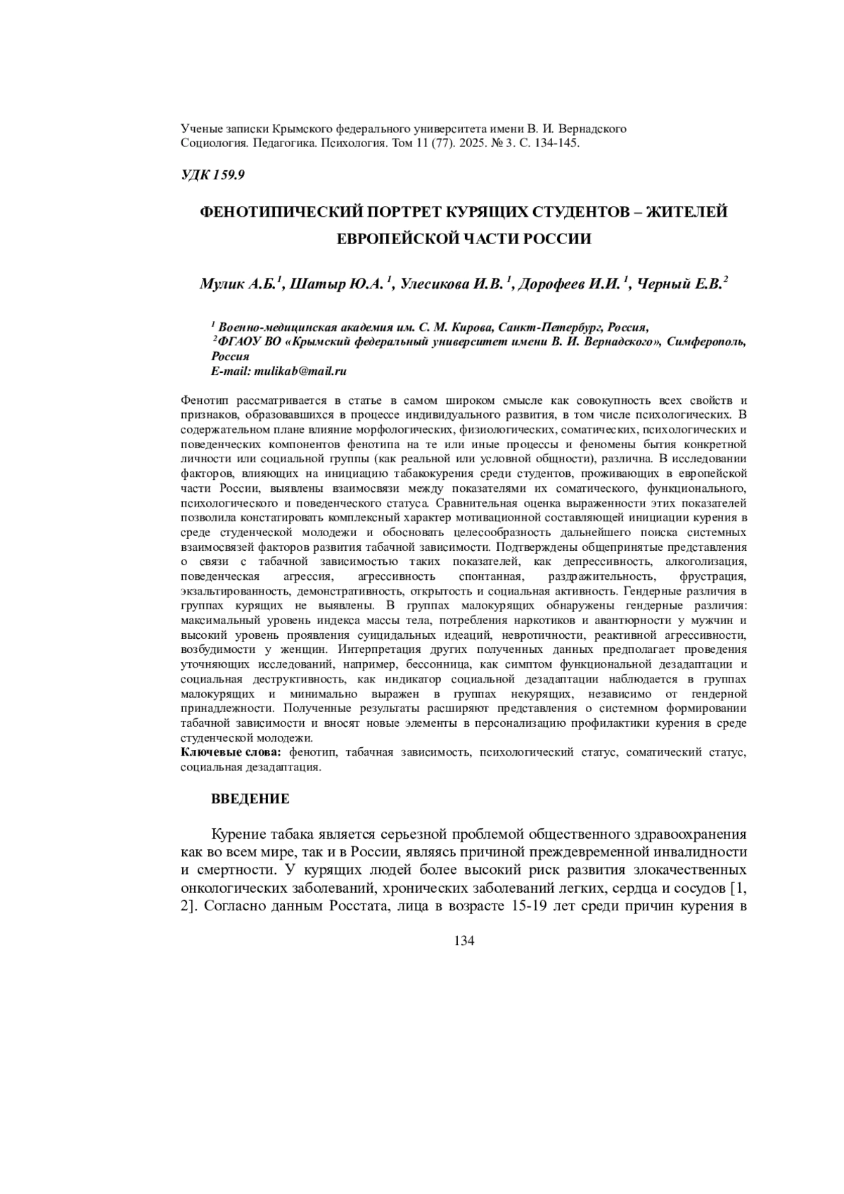 25. Мулик А.Б. Особенности свойств личности у курящих студентов - жителей северных территорий России / А.Б. Мулик, Ю.А. Шатыр, И.В. Улесикова, А.Г. Соловьев, Н.О. Назаров, Е.В. Чёрный // Экология человека. - 2022. - № 9. - С. 663-671. EDN: ECFVPD