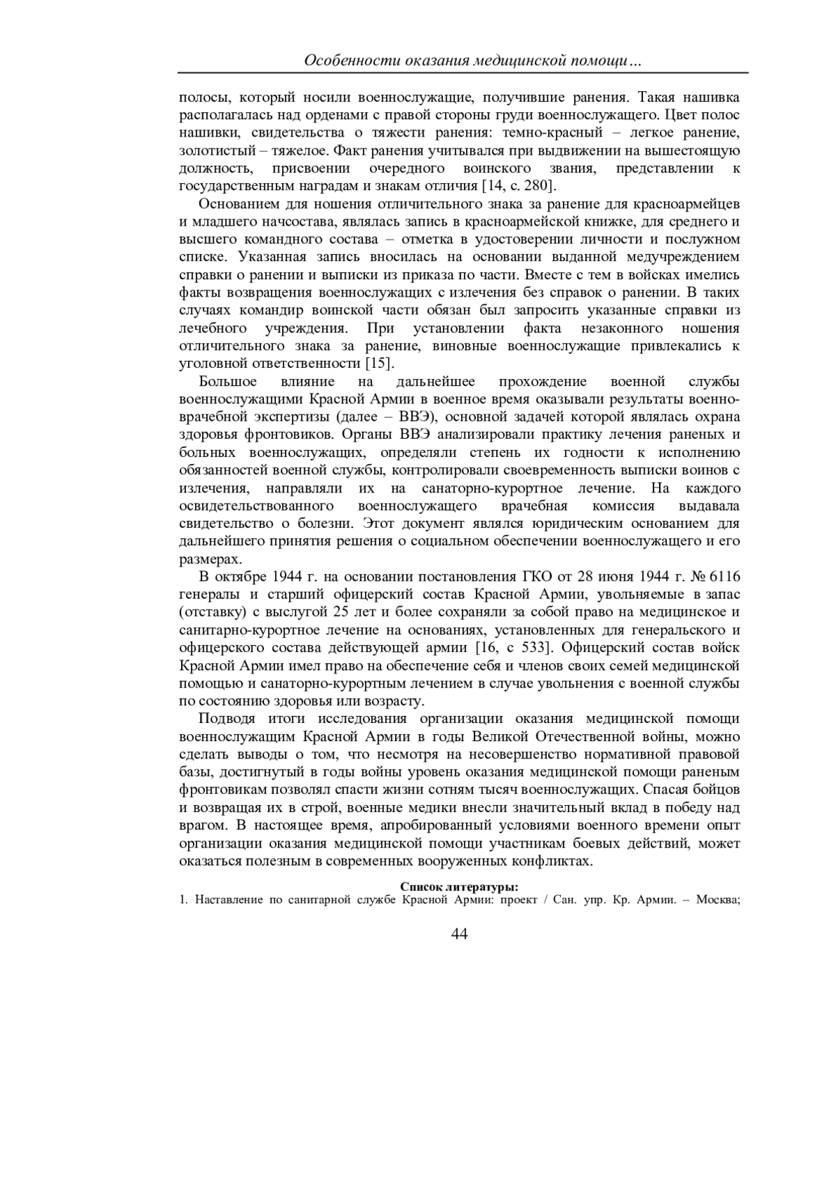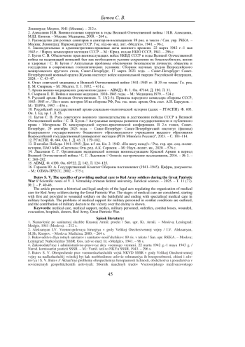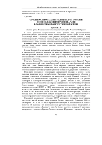 БУТОВ С. В. ОСОБЕННОСТИ ОКАЗАНИЯ МЕДИЦИНСКОЙ ПОМОЩИ ВОЕННОСЛУЖАЩИМ КРАСНОЙ АРМИИ В ГОДЫ ВЕЛИКОЙ ОТЕЧЕСТВЕННОЙ ВОЙНЫ // УЧЕНЫЕ ЗАПИСКИ КРЫМСКОГО ФЕДЕРАЛЬНОГО УНИВЕРСИТЕТА ИМЕНИ В. И. ВЕРНАДСКОГО. ЮРИДИЧЕСКИЕ НАУКИ. 2025. ТОМ 11. №2