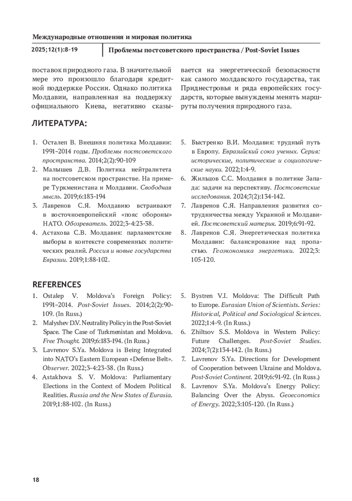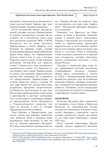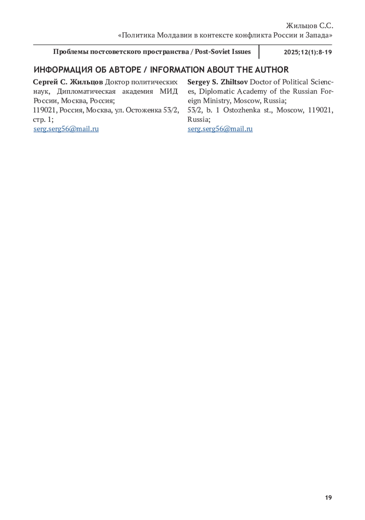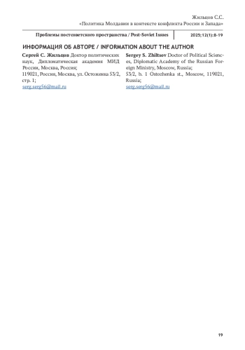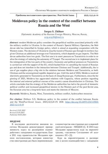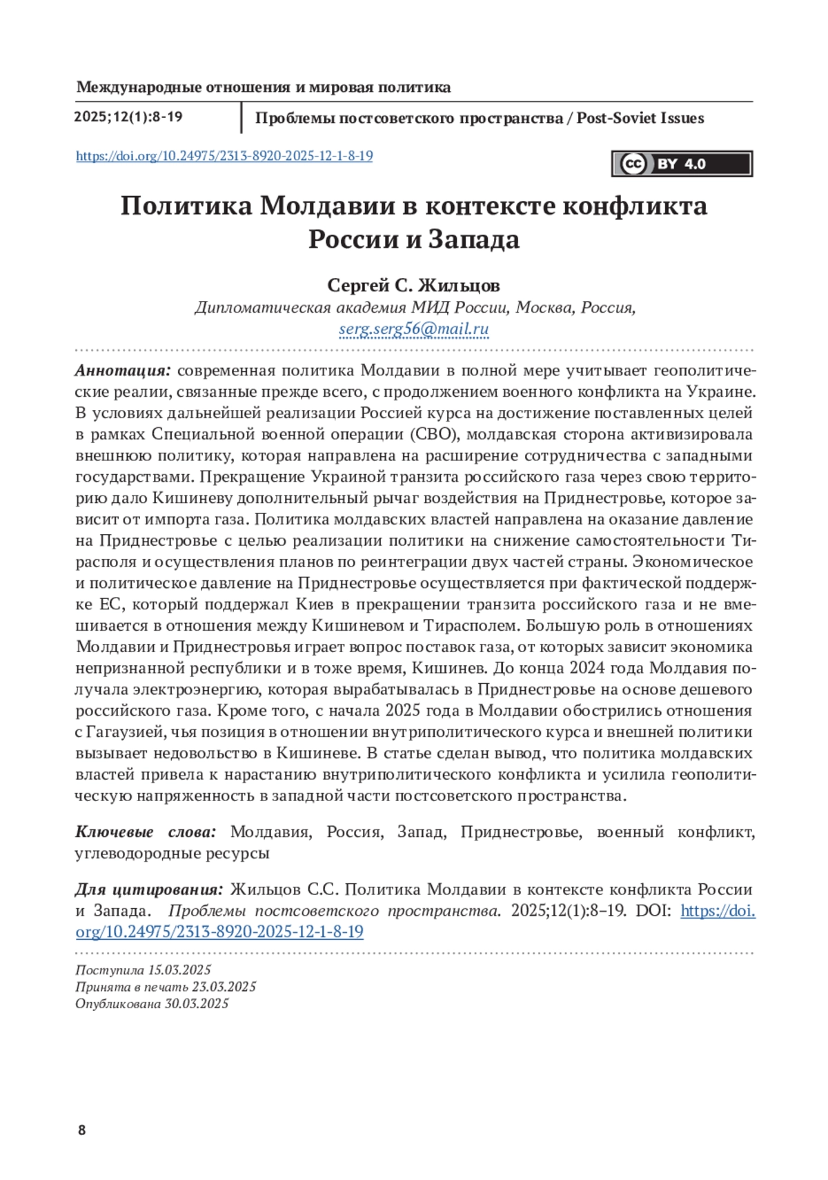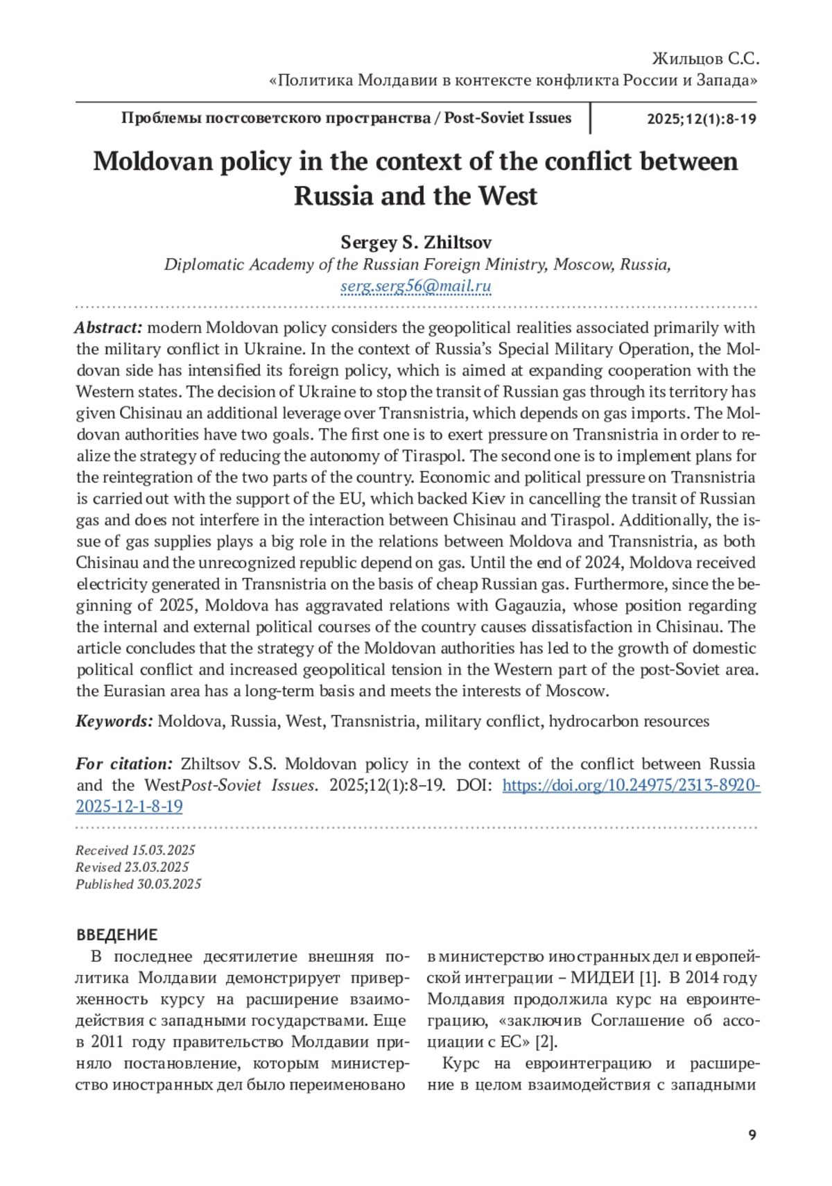 ЖИЛЬЦОВ С. С. ПОЛИТИКА МОЛДАВИИ В КОНТЕКСТЕ КОНФЛИКТА РОССИИ И ЗАПАДА // ПРОБЛЕМЫ ПОСТСОВЕТСКОГО ПРОСТРАНСТВА. 2025. ТОМ 12, № 1