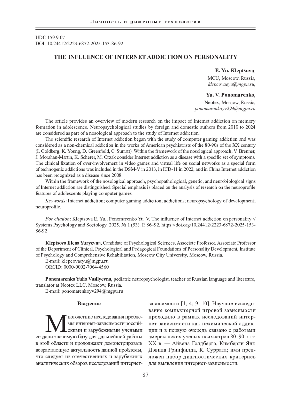 В статье предложен обзор современных исследований проблемы влияния интернет-зависимости на формирование памяти в подростковом возрасте. Рассмотрены нейропсихологические исследования зарубежных и отечественных авторов с 2010 по 2024 г. в рамках нозологического подхода к изучению интернет-зависимости.