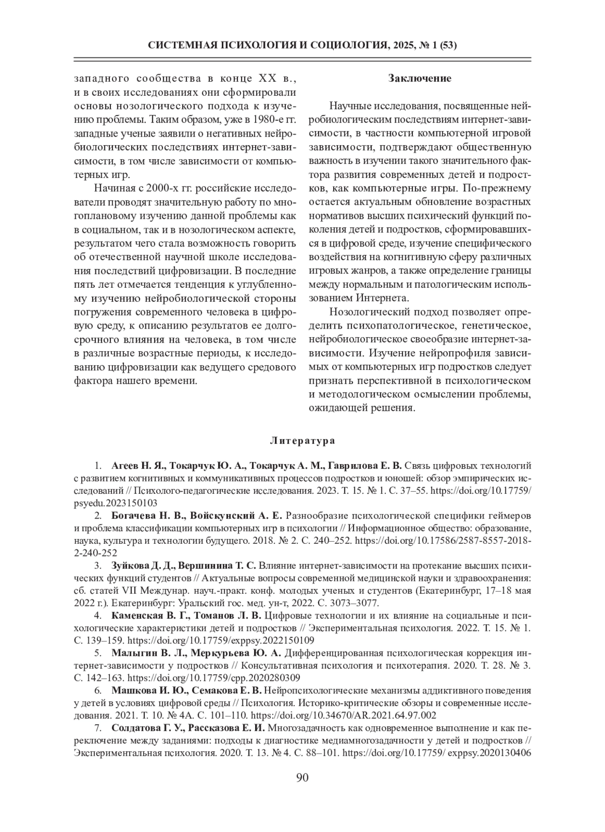 1. Агеев Н. Я., Токарчук Ю. А., Токарчук А. М., Гаврилова Е. В. Связь цифровых технологий с развитием когнитивных и коммуникативных процессов подростков и юношей: обзор эмпирических исследований // Психолого-педагогические исследования. 2023. Т. 15. № 1. С. 37-55. DOI: 10.17759/psyedu.2023150103 EDN: DYSELX