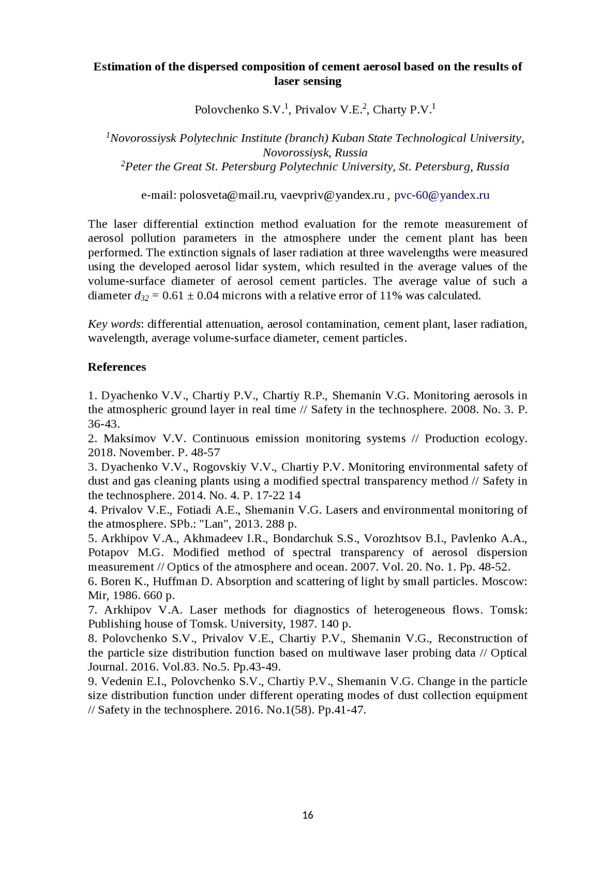 ПОЛОВЧЕНКО С. В., ПРИВАЛОВ В. Е., ЧАРТИЙ П. В. ОЦЕНКА ДИСПЕРСНОГО СОСТАВА ЦЕМЕНТНОГО АЭРОЗОЛЯ ПО РЕЗУЛЬТАТАМ ЛАЗЕРНОГО ЗОНДИРОВАНИЯ // ЛАЗЕРЫ. ИЗМЕРЕНИЯ. ИНФОРМАЦИЯ. 2024. № 4 (16), ТОМ 4