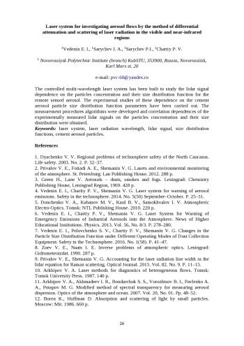3. Дьяченко В.В., Роговский В.В., Чартий П.В. Контроль экологической безопасности пылегазоочистных установок модифицированным методом спектральной прозрачности // Безопасность в техносфере. 2014. № 4. С.17-22 14.