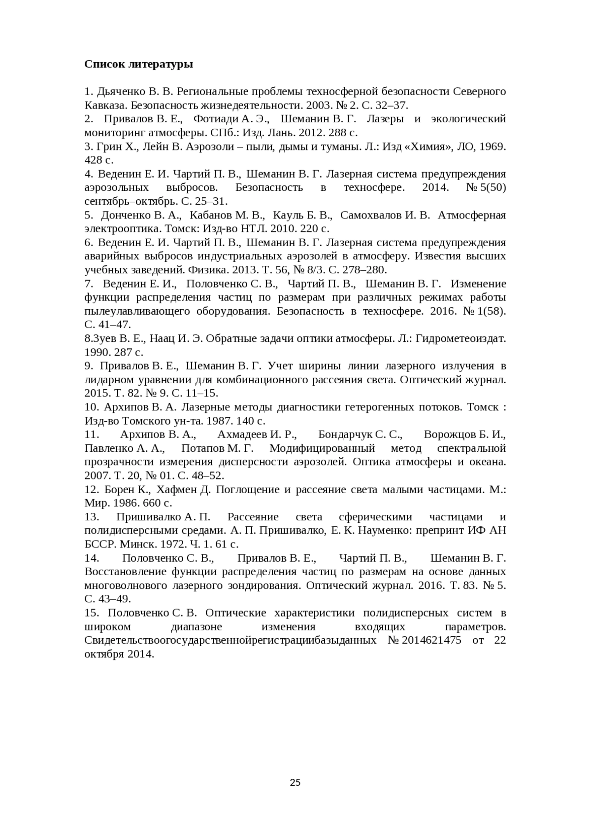 8. Половченко С.В., Привалов В.Е., Чартий П.В., Шеманин В.Г., Восстановление функции распределения частиц по размерам на основе данных многоволнового лазерного зондирования // Оптический журнал. 2016. Т.83. №5. С. 43-49.