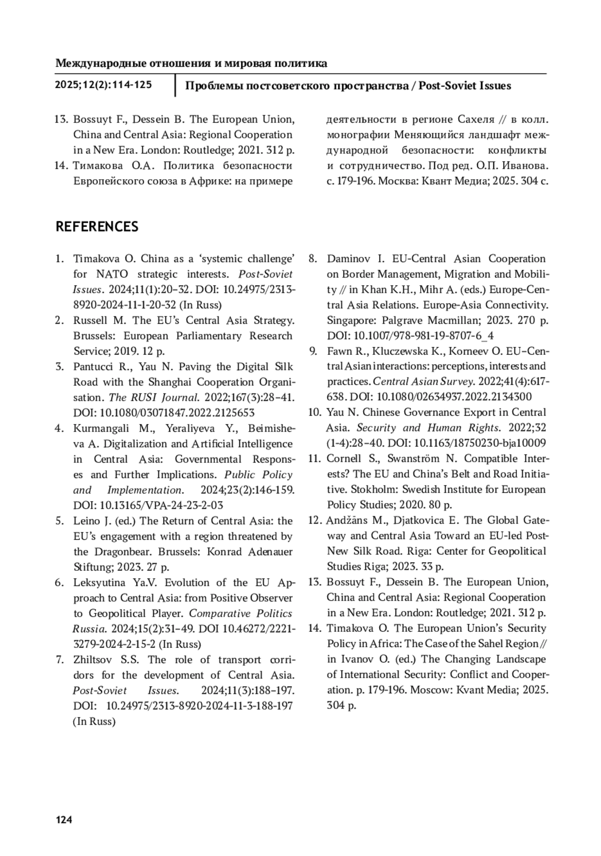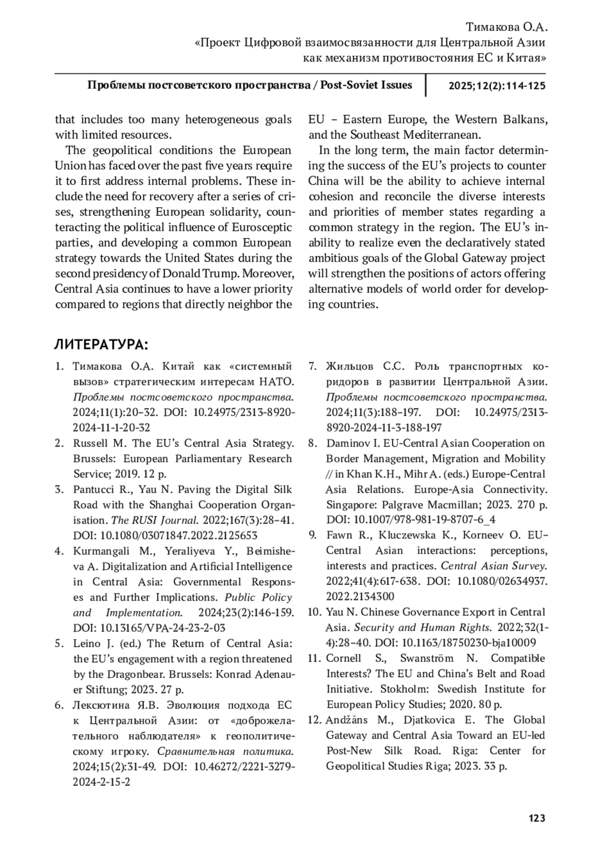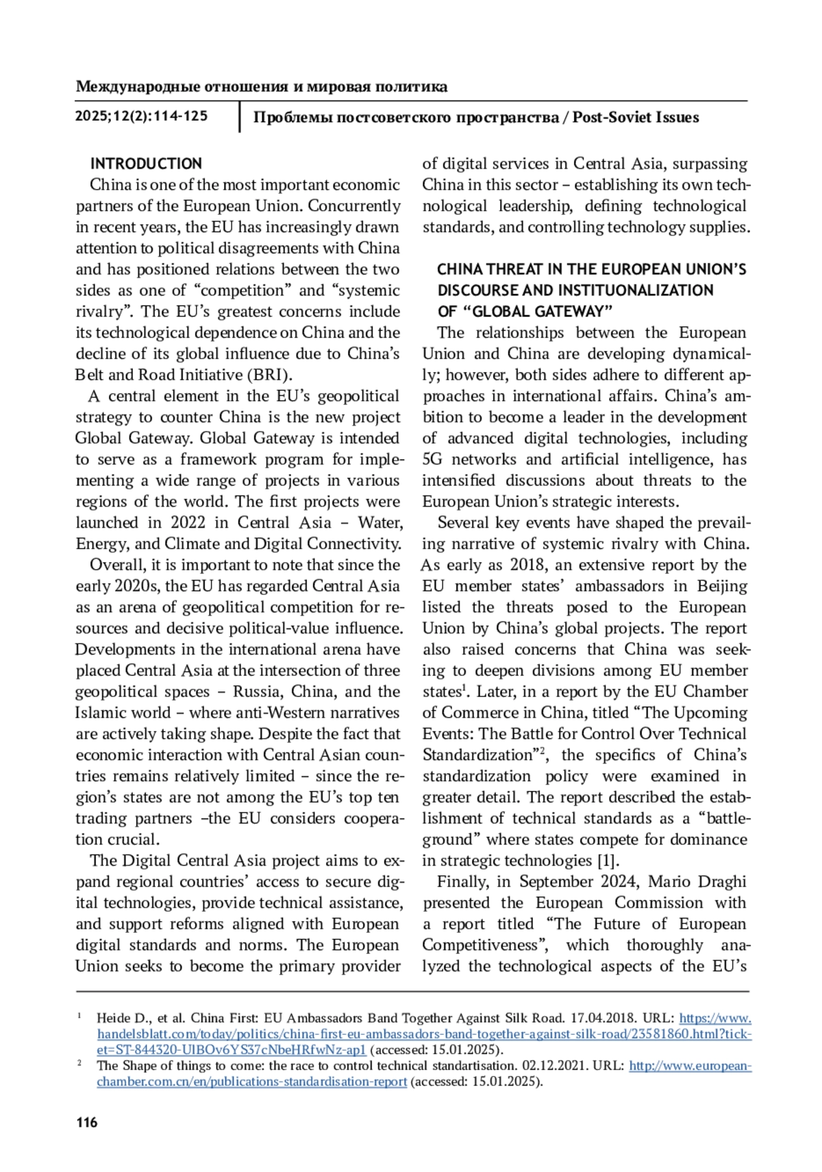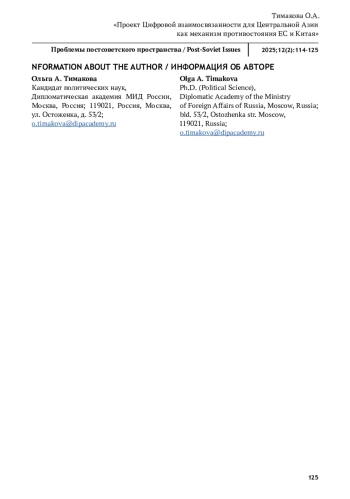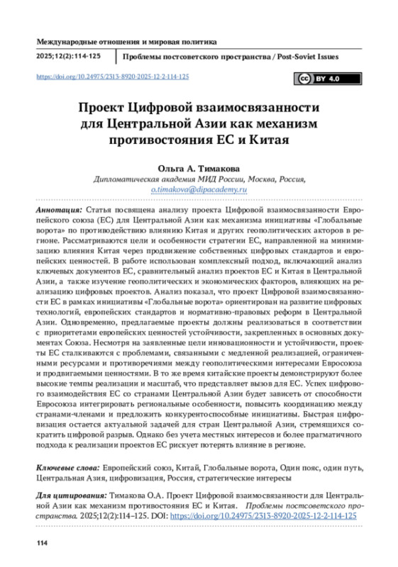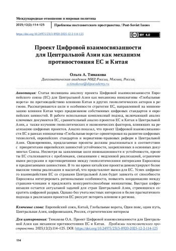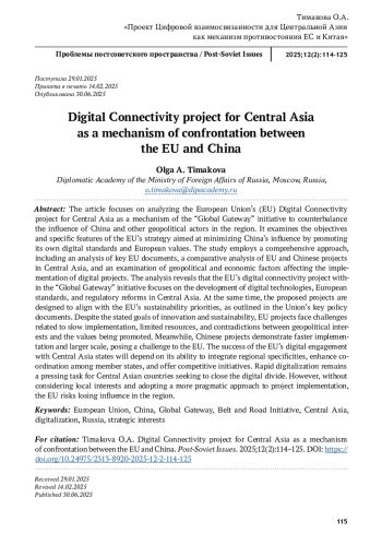 Статья посвящена анализу проекта Цифровой взаимосвязанности Европейского союза (ЕС) для Центральной Азии как механизма инициативы «Глобальные ворота» по противодействию влиянию Китая и других геополитических акторов в регионе. Рассматриваются цели и особенности стратегии ЕС, направленной на минимизацию влияния Китая через продвижение собственных цифровых стандартов и европейских ценностей. В работе использован комплексный подход, включающий анализ ключевых документов ЕС, сравнительный анализ проектов ЕС и Китая в Центральной Азии, а также изучение геополитических и экономических факторов, влияющих на реализацию цифровых проектов. Анализ показал, что проект Цифровой взаимосвязанности ЕС в рамках инициативы «Глобальные ворота» ориентирован на развитие цифровых технологий, европейских стандартов и нормативно-правовых реформ в Центральной Азии. Одновременно, предлагаемые проекты должны реализоваться в соответствии с приоритетами европейских ценностей устойчивости, закрепленных в основных документах Союза. Несмотря на заявленные цели инновационности и устойчивости, проекты ЕС сталкиваются с проблемами, связанными с медленной реализацией, ограниченными ресурсами и противоречиями между геополитическими интересами Евросоюза и продвигаемыми ценностями. В то же время китайские проекты демонстрируют более высокие темпы реализации и масштаб, что представляет вызов для ЕС. Успех цифрового взаимодействия ЕС со странами Центральной Азии будет зависеть от способности Евросоюза интегрировать региональные особенности, повысить координацию между странами-членами и предложить конкурентоспособные инициативы. Быстрая цифровизация остается актуальной задачей для стран Центральной Азии, стремящихся сократить цифровой разрыв. Однако без учета местных интересов и более прагматичного подхода к реализации проектов ЕС рискует потерять влияние в регионе.