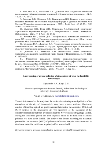 10. Дьяченко В.В., Куля Д.Н., Мореходов А.А.Оптический мониторинг аэрозольного загрязнения воздуха в г. Новороссийске // Лазеры. Измерения. Информация. - 2024. -Т. 4, № 3. - С. 37-45. EDN: KETMSN