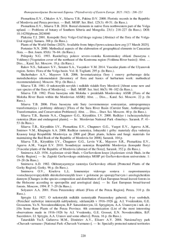 31. [Pismarkina et al., 2020] Письмаркина Е.В., Чкалов А.В., Силаева Т.Б., Пакина Д.В. 2000. Флористические находки в Республике Мордовия и Пензенской области. - Бюлл. МОИП. Отд. биол. 125(3): 49-51.