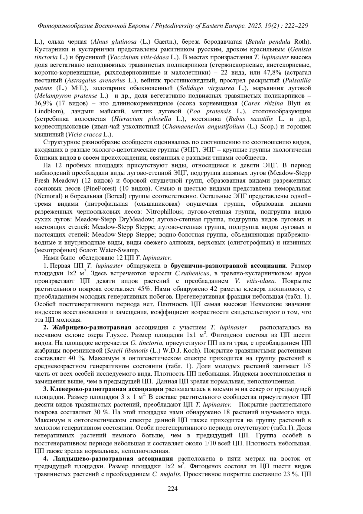 На примере национального парка «Марий Чодра» изучены 12 ценопопуляций (ЦП) Trifolium lupinaster. Все ЦП нормальные неполночленные. В спектрах большинства ЦП максимум приходится на растения генеративного периода. Средняя плотность особей в ЦП составляет 3,3 шт/м2. Вызывают опасение невысокие индексы восстановления и замещения, поскольку они свидетельствуют о незначительном возобновлении особей. В растительных сообществах с участием T. lupinaster выявлено 46 видов растений, относящихся к 22 семействам. Флористическое богатство колеблется от шести до 13 видов. Видовая насыщенность варьирует от 0,6 до 9,0 видов на м2. В ЦП преобладают длиннокорневищные травянистые растения (27,3 %). Среди эколого-ценотических ведущую роль играют виды лугово-степной (подгруппа влажных лугов (27 %) и боровой опушечной групп, образованная видами разреженных сосновых лесов (22 %).