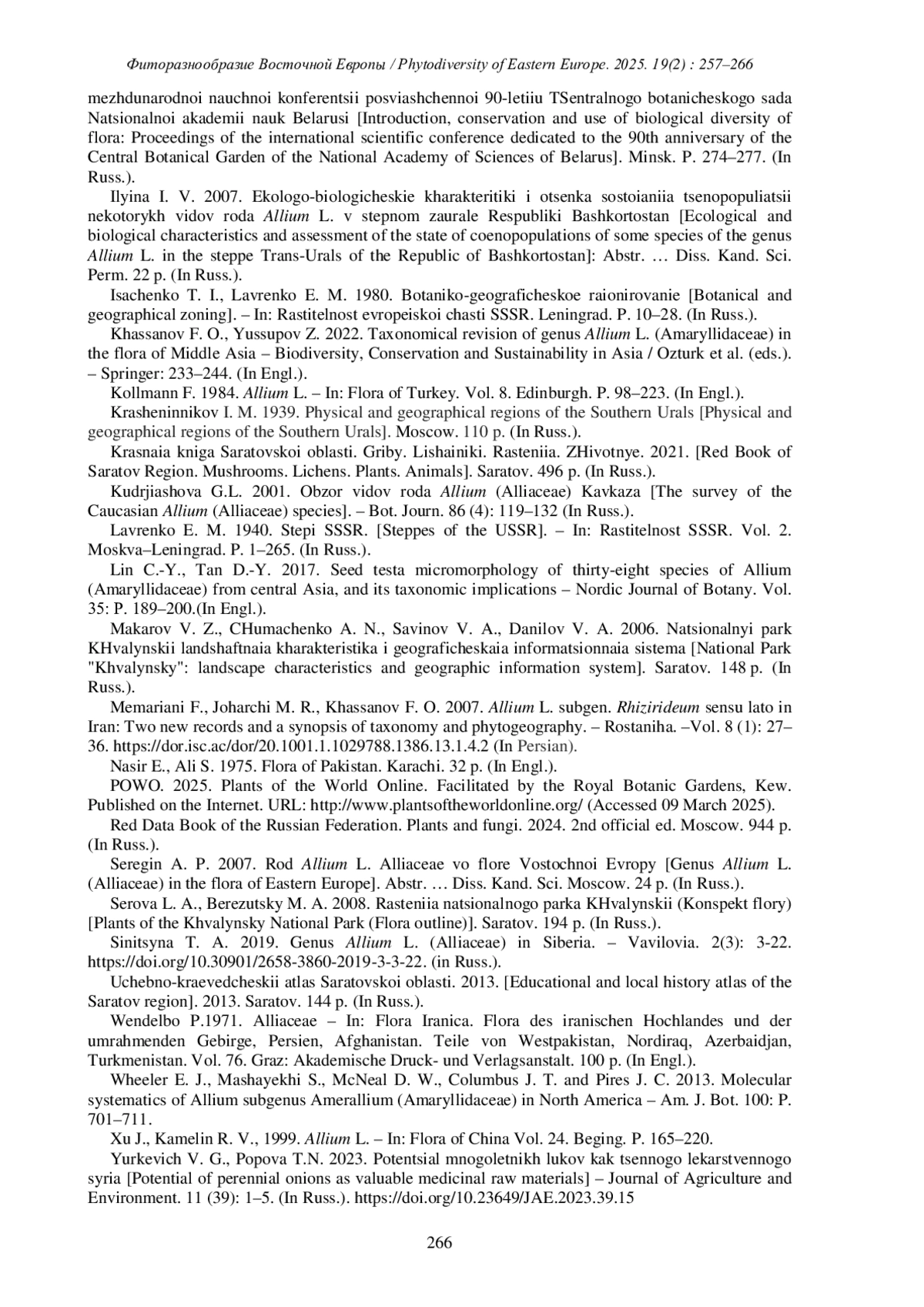 3. [Bulaniy et al.] Буланый Ю. И., Нющенко, Е. А., Солянников, В. В. 2023. Род Allium во флоре Саратовской области: ключ для определения и некоторые особенности распространения видов. - В кн.: Сборник научных статей II Всероссийской научной конференции с международным участием, посвящённой десятилетию восстановления экосистем (2020-2030). Саратов. С. 22-24.