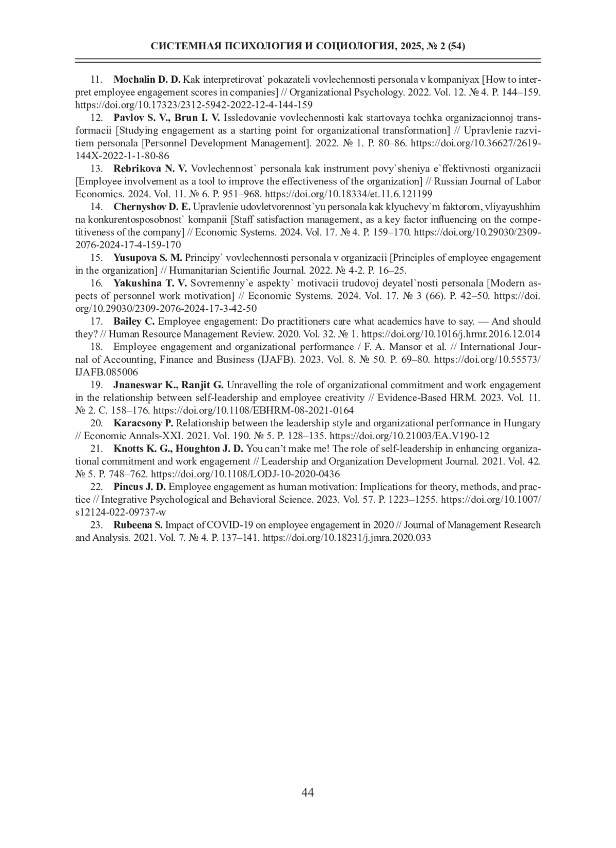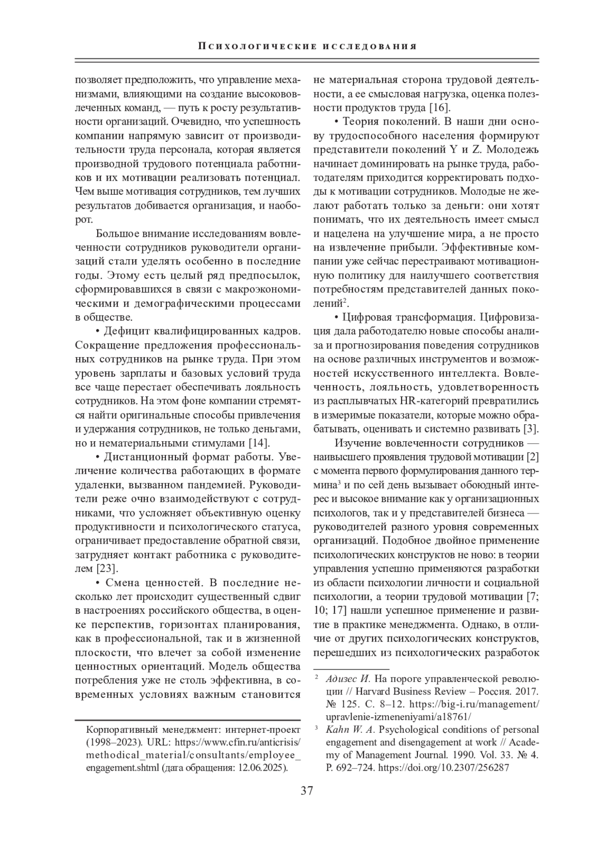 Хотя проблеме вовлеченности сотрудников в работу организации уделяется много внимания, недостаточно представлен анализ факторов, связанных с этой характеристикой. В связи с вышеизложенным цель настоящей работы - обобщение факторов, взаимосвязанных с вовлеченностью сотрудников в процесс работы организации, на основе зарубежных исследований данной проблемы.