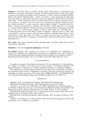В начале июня 2024 г. в результате флористических исследований в 12 пунктах в Камешкирском, Кузнецком, Неверкинском и Пензенском районах Пензенской области выявлено 584 вида сосудистых растений. К числу редких растений, нуждающихся в охране, отнесено 29 видов, из них 3 вида занесены в Красную книгу Российской Федерации (Red…, 2024): Iris aphylla L., Stipapulcherrima K. Koch, Stipa rubens P. A. Smirn. [ S. zalesskii auct. p. p.] и 28 видов - в Красную книгу Пензенской области (Red…, 2024): Adonanthe vernalis (L.) Spach, Allium flavescens Besser, Amygdalus nana L., Aster amellus L., Astragalus varius S. G. Gmel., Carex hartmaniorum Cajander, Dianthus volgicus Juz., Ephedra distachya L., Gagea erubescens ( Besser) Schult. et Schult. f., Galatella villosa (L.) Rchb. f., Gentiana pneumonanthe L., Gladiolus tenuis M. Bieb., Gratiola officinalis L., Iris aphylla L., Jacobaea fluviatilis (Wallr.) E. Wiebe, Lilium pilosiuscum (Freyn) Miscz., Pentanema germanicum (L.) D. Gut. Larr., Santos-Vicente, Anderb., E. Rico et M. M. Mart. Ort., Potentilla alba L., Pseudopodospermum tauricum (M. Bieb.) Vasjukov et Saksonov, Pulsatilla patens (L.) Mill., Salix rosmarinifolia L., Spiraea crenata L., Stipa borysthenica Klokov ex Prokudin, Stipa pennata L., Stipa pulcherrima K. Koch, Stipa rubens P. A. Smirn. [ S. zalesskii auct. p. p.], Stipa tirsa Steven, Trinia multicaulis (Poir.) Schischk. Предложено к организации на региональном уровне три особо охраняемых природных территории.