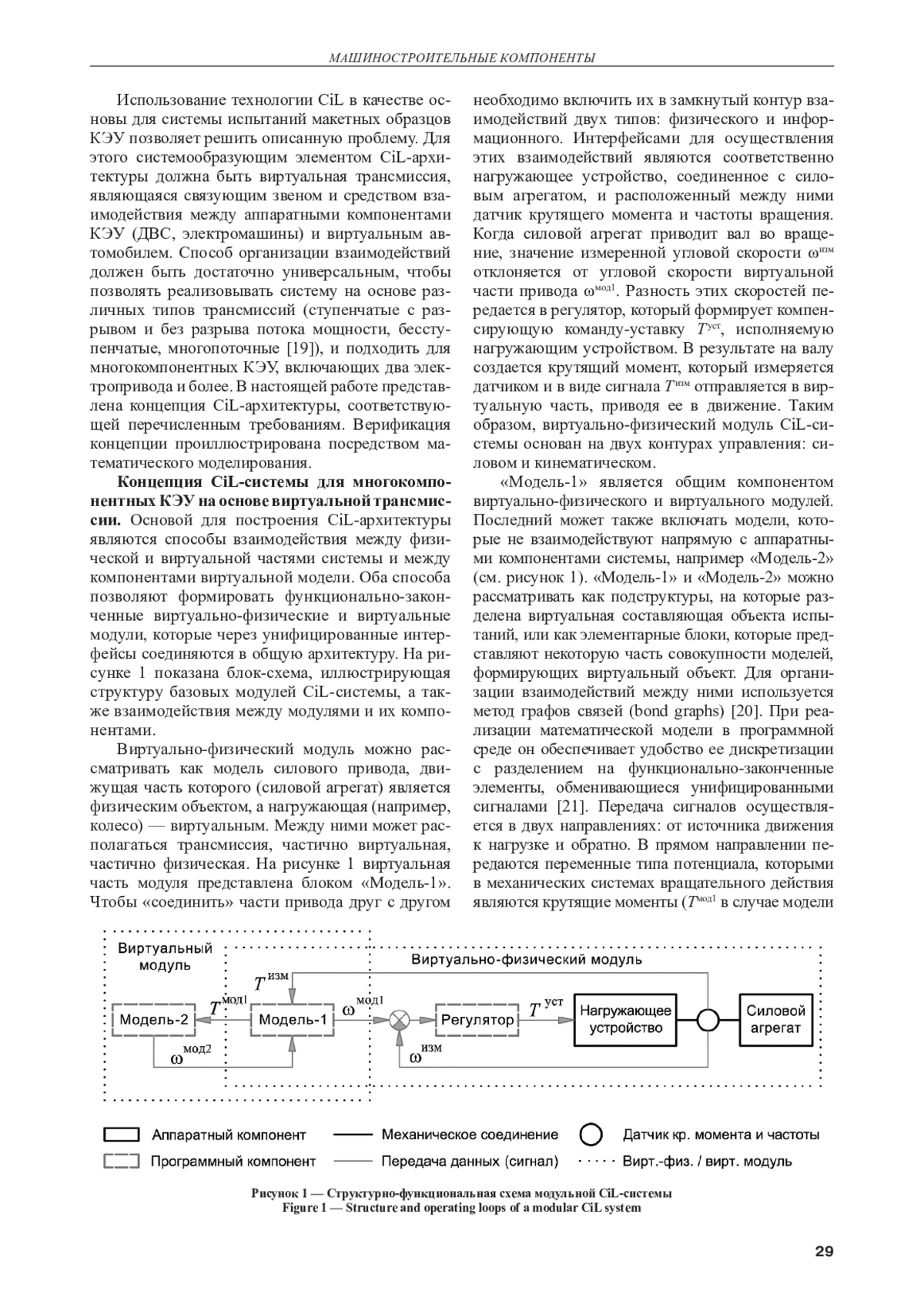 В статье предложена и верифицирована концепция системы типа Component-in-the-Loop (CiL), предназначенной для лабораторных виртуально-физических испытаний автомобильных комбинированных (гибридных) энергоустановок (КЭУ). Особенностью концепции является модульная архитектура с унифицированными способами взаимодействия между физической и виртуальной частями системы, а также между виртуальными компонентами. Основу виртуальной части CiL-системы составляет модель трансмиссии, тип которой может быть выбран в зависимости от схемы исследуемой энергоустановки. Взаимодействуя с установленными на стенде силовыми агрегатами посредством динамометров, модель согласует их нагрузочные режимы в соответствии с имитируемыми режимами функционирования КЭУ и движения автомобиля. Данный подход позволяет строить масштабируемые CiL-системы для энергоустановок с произвольным числом агрегатов. Верификация концепции выполнена посредством вычислительных экспериментов с математической моделью CiL-системы на основе КЭУ Toyota Hybrid System с двухпоточной бесступенчатой трансмиссией. Результаты моделирования показывают, что CiL-система адекватно воспроизводит работу КЭУ в заданных режимах движения автомобиля, а ее управляющая структура функционирует в соответствии с заложенными принципами и является устойчивой.