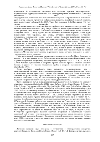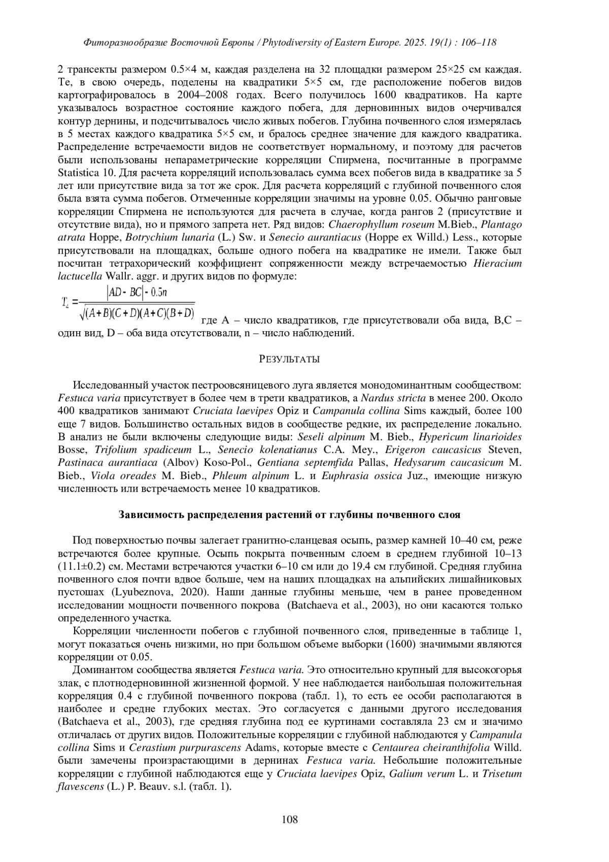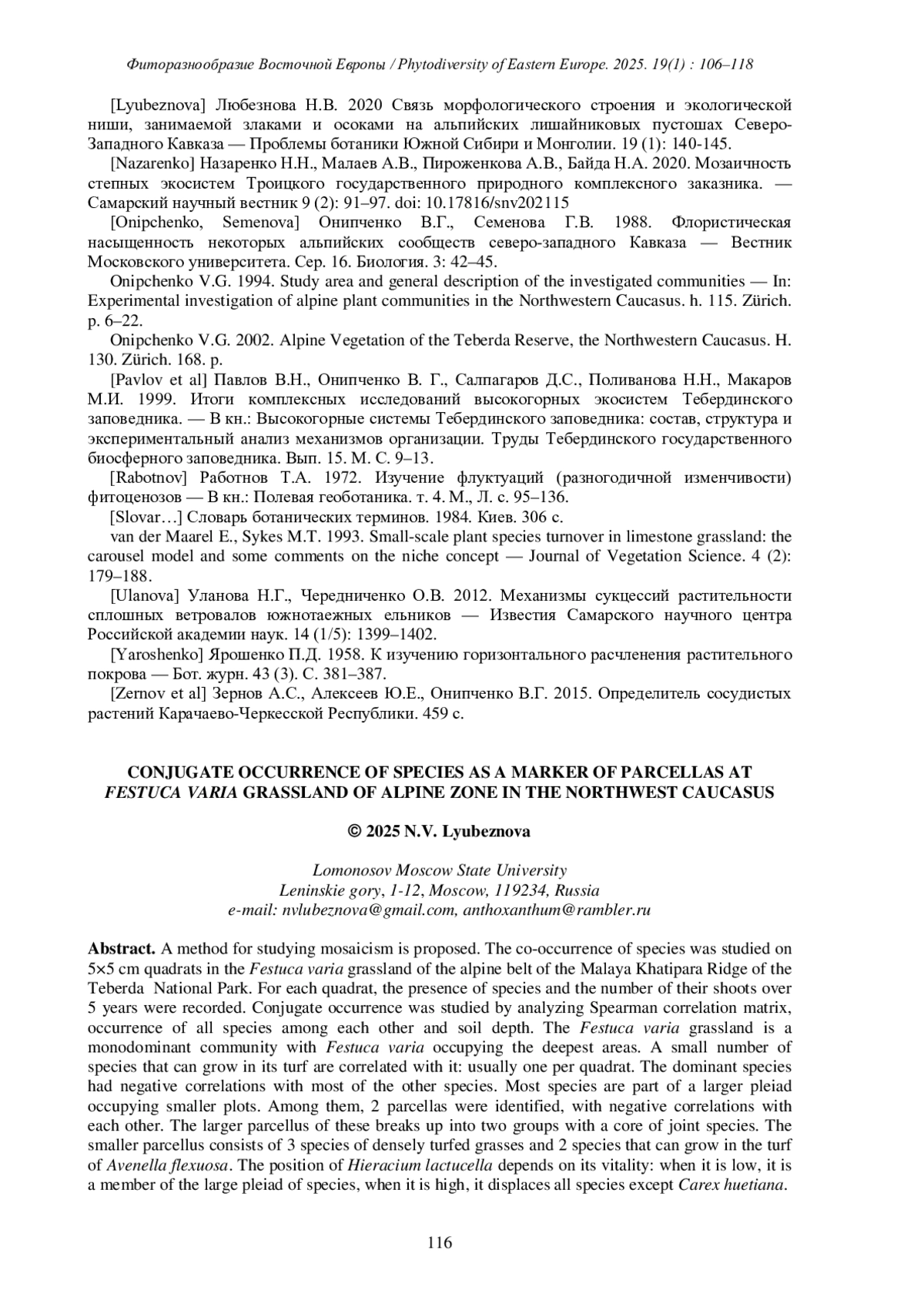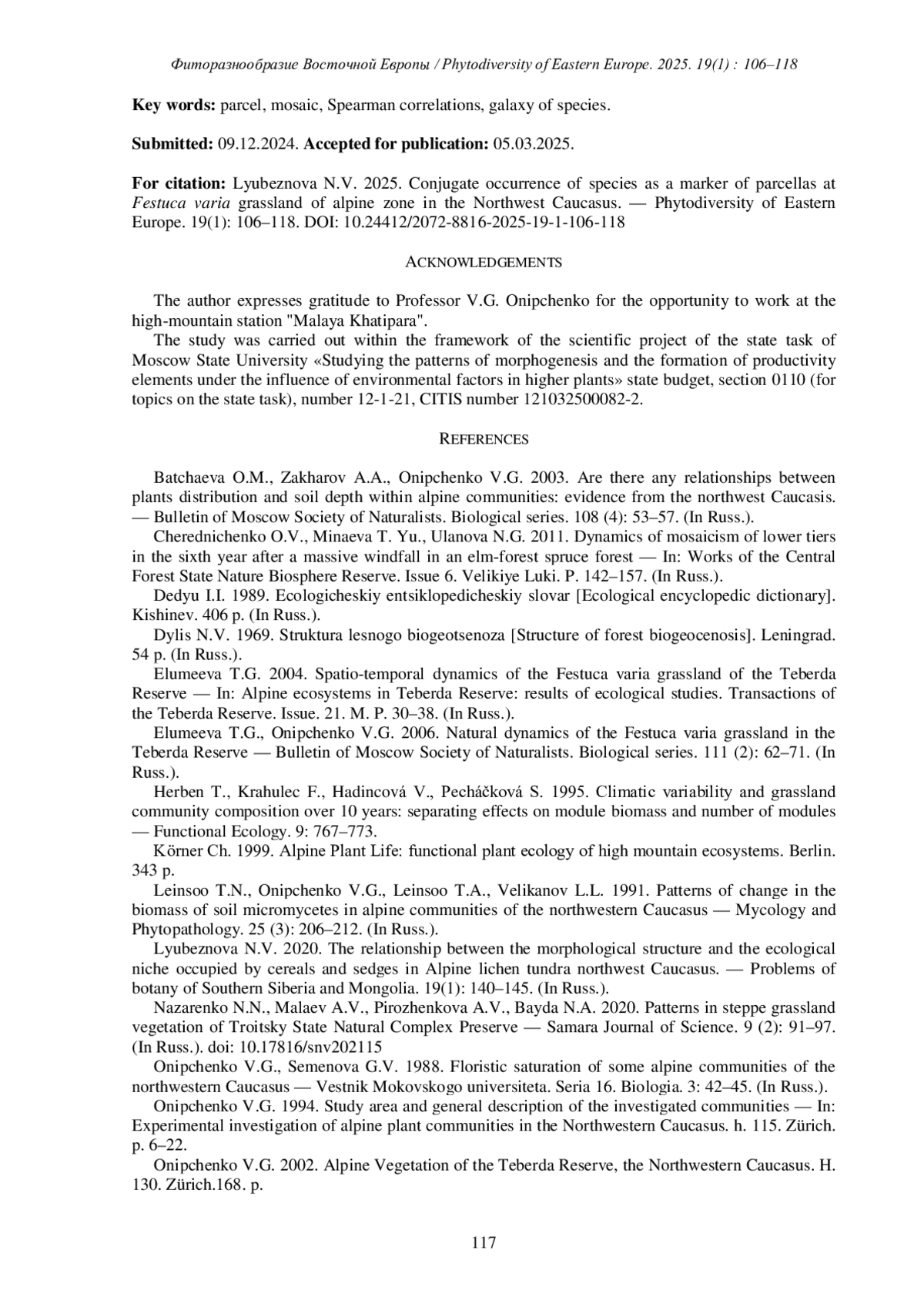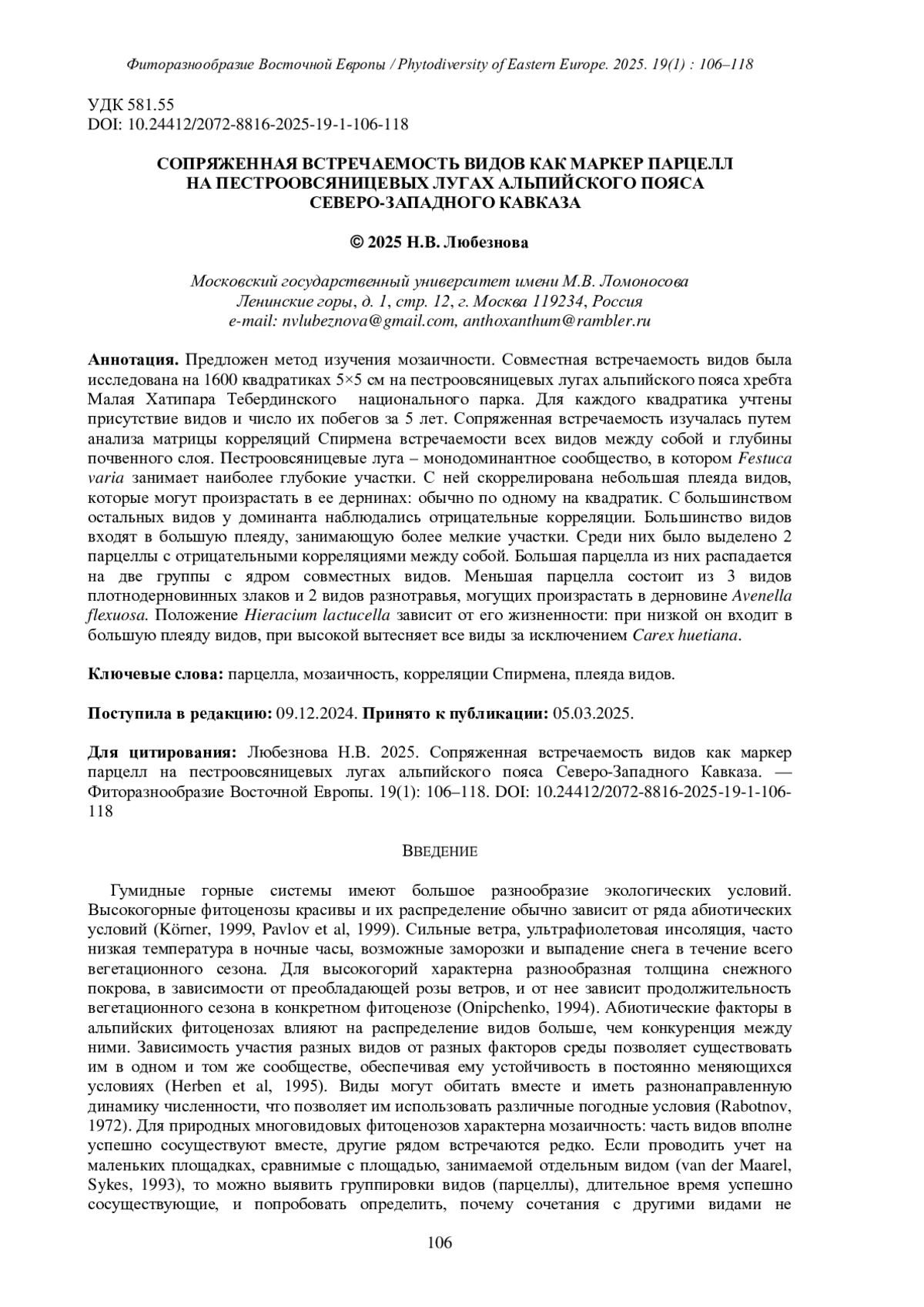Предложен метод изучения мозаичности. Совместная встречаемость видов была исследована на 1600 квадратиках 5×5 см на пестроовсяницевых лугах альпийского пояса хребта Малая Хатипара Тебердинского национального парка. Для каждого квадратика учтены присутствие видов и число их побегов за 5 лет. Сопряженная встречаемость изучалась путем анализа матрицы корреляций Спирмена встречаемости всех видов между собой и глубины почвенного слоя. Пестроовсяницевые луга - монодоминантное сообщество, в котором Festuca varia занимает наиболее глубокие участки. С ней скоррелирована небольшая плеяда видов, которые могут произрастать в ее дернинах: обычно по одному на квадратик. С большинством остальных видов у доминанта наблюдались отрицательные корреляции. Большинство видов входят в большую плеяду, занимающую более мелкие участки. Среди них было выделено 2 парцеллы с отрицательными корреляциями между собой. Большая парцелла из них распадается на две группы с ядром совместных видов. Меньшая парцелла состоит из 3 видов плотнодерновинных злаков и 2 видов разнотравья, могущих произрастать в дерновине Avenella flexuosa. Положение Hieracium lactucella зависит от его жизненности: при низкой он входит в большую плеяду видов, при высокой вытесняет все виды за исключением Carex huetiana.