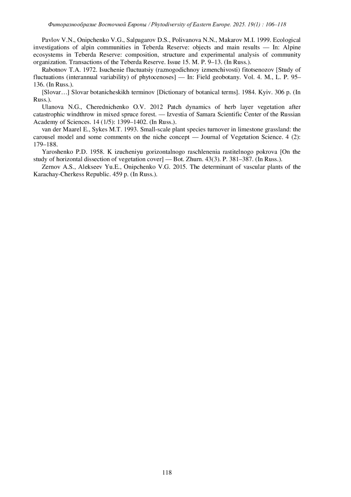 12. [Onipchenko, Semenova] Онипченко В.Г., Семенова Г.В. 1988. Флористическая насыщенность некоторых альпийских сообществ северо-западного Кавказа - Вестник Московского университета. Сер. 16. Биология. 3: 42-45.