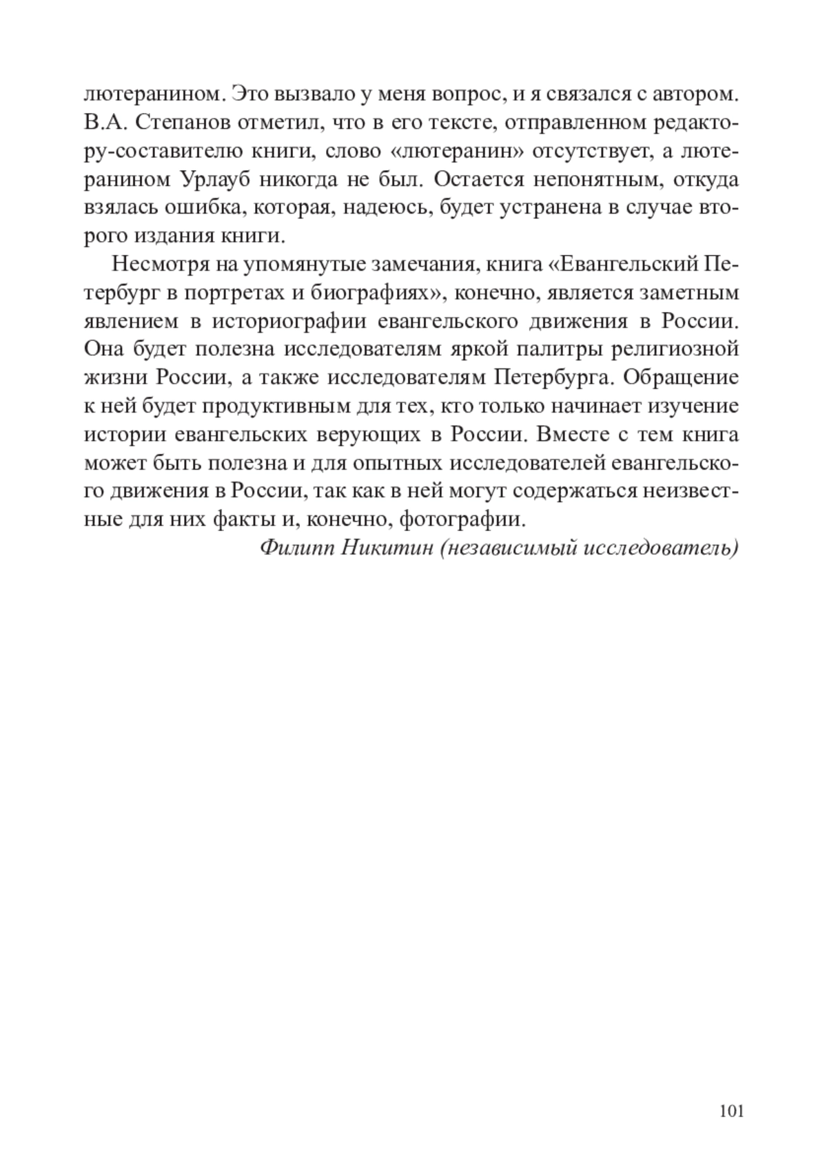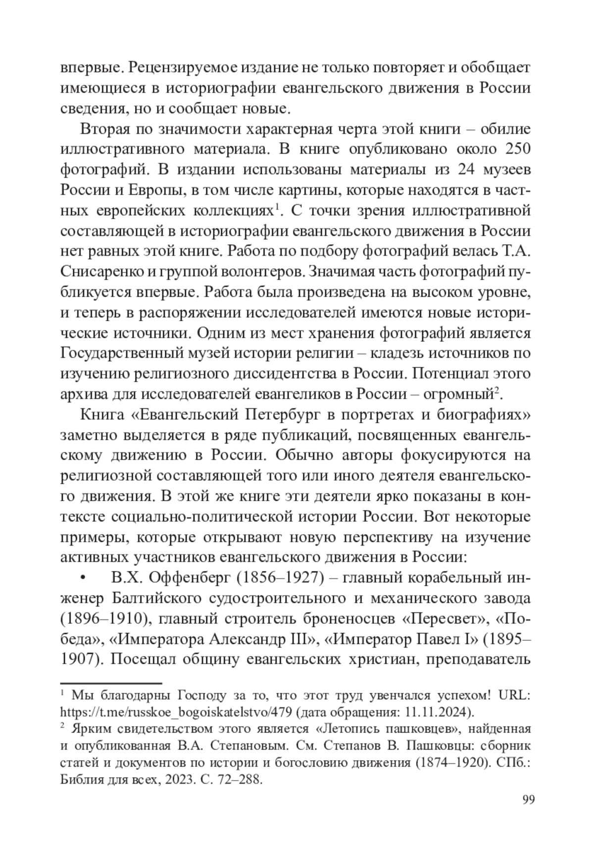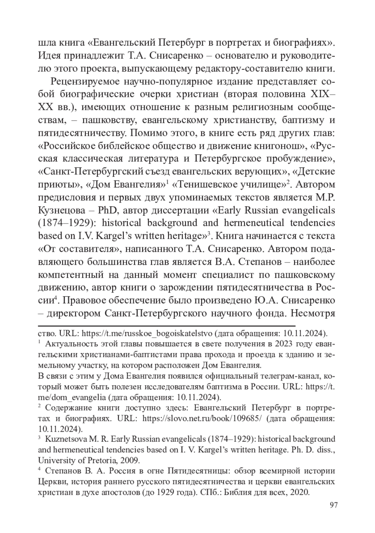 В 2024 году в издательском доме «Инкери» вышла книга «Евангельский Петербург в портретах и биографиях». Идея принадлежит Т. А. Снисаренко – основателю и руководителю этого проекта, выпускающему редактору-составителю книги.
