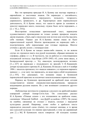 Таирова И.А. Смысловые и формальные трансформации художественных текстов И. А. Бунина в переводах на арабский язык // Наследие научных школ кафедры русской литературы XX-XXI вв. Института филологии МПГУ. К 150-летию университета. Материалы XXVII Шешуковских чтений. Под общей редакцией Л.А. Трубиной, сост. Л.А. Трубина, Д.В. Поль, И.С. Урюпин. Москва: МПГУ, 2023. С. 224-229.