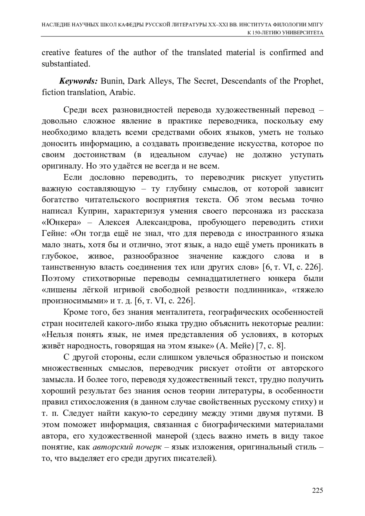 В статье излагаются общие принципы художественного перевода. Рассматриваются переводы на арабский язык произведений Бунина («Тайна», «Потомки Пророка»; «Тёмные аллеи»). Упоминаются стихотворные переводы Бунина с европейских языков. Указываются неточности перевода лексических образных средств. Утверждается и обосновывается мысль о важности изучения творческих особенностей автора переводимого материала.