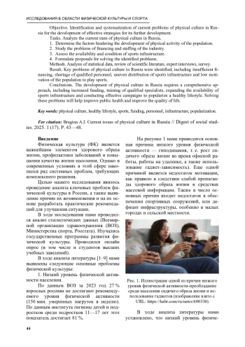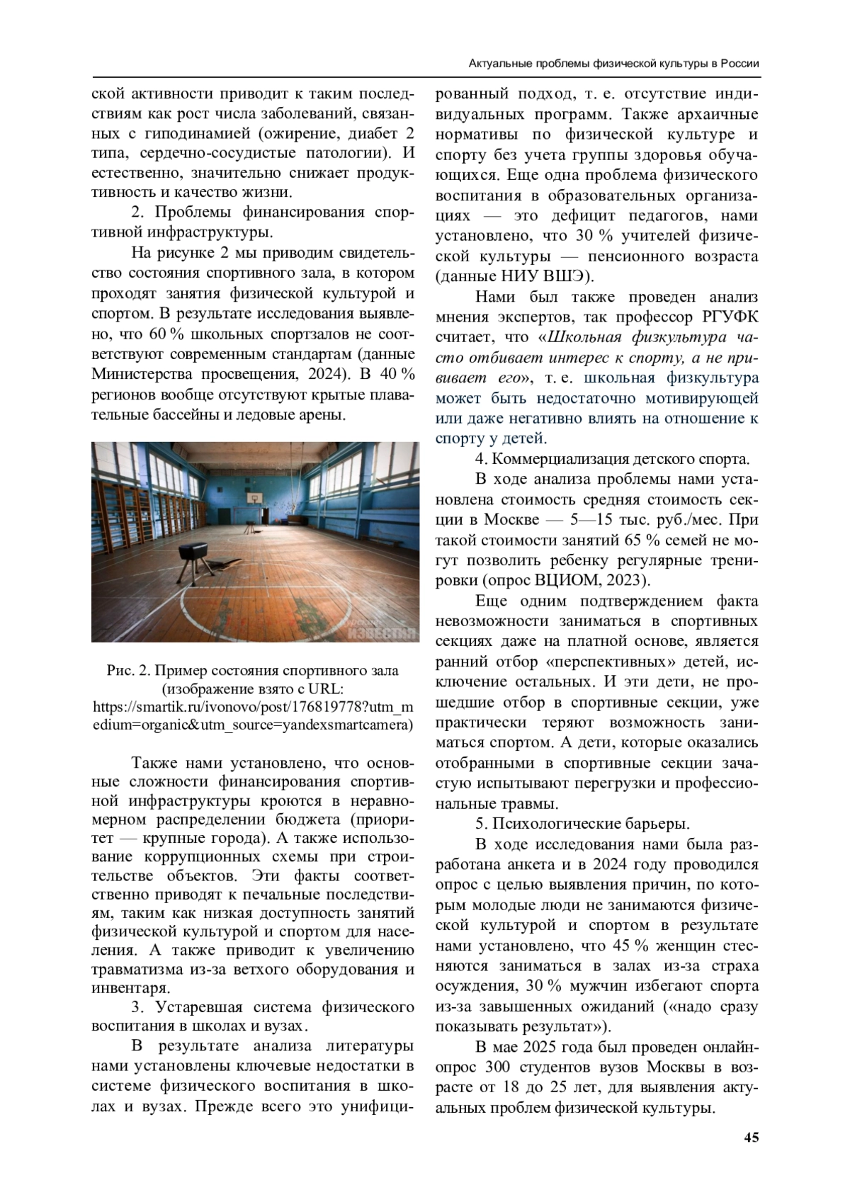 Результат. Выявлены ключевые проблемы физической культуры в России, включая недо-статочное финансирование, нехватку квалифицированных кадров, неравномерное распределение спортивной инфраструктуры и низкую мотивацию населения к занятиям спортом.