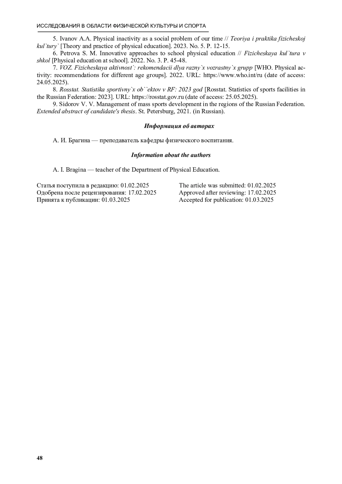 6. Петрова С. М. Инновационные подходы к школьной физкультуре // Физическая ВОЗ культура в школе. 2022. № 3. С. 45-48.