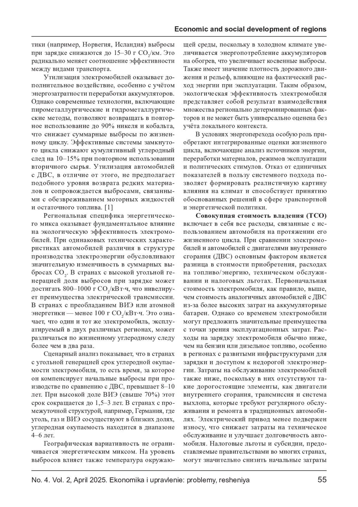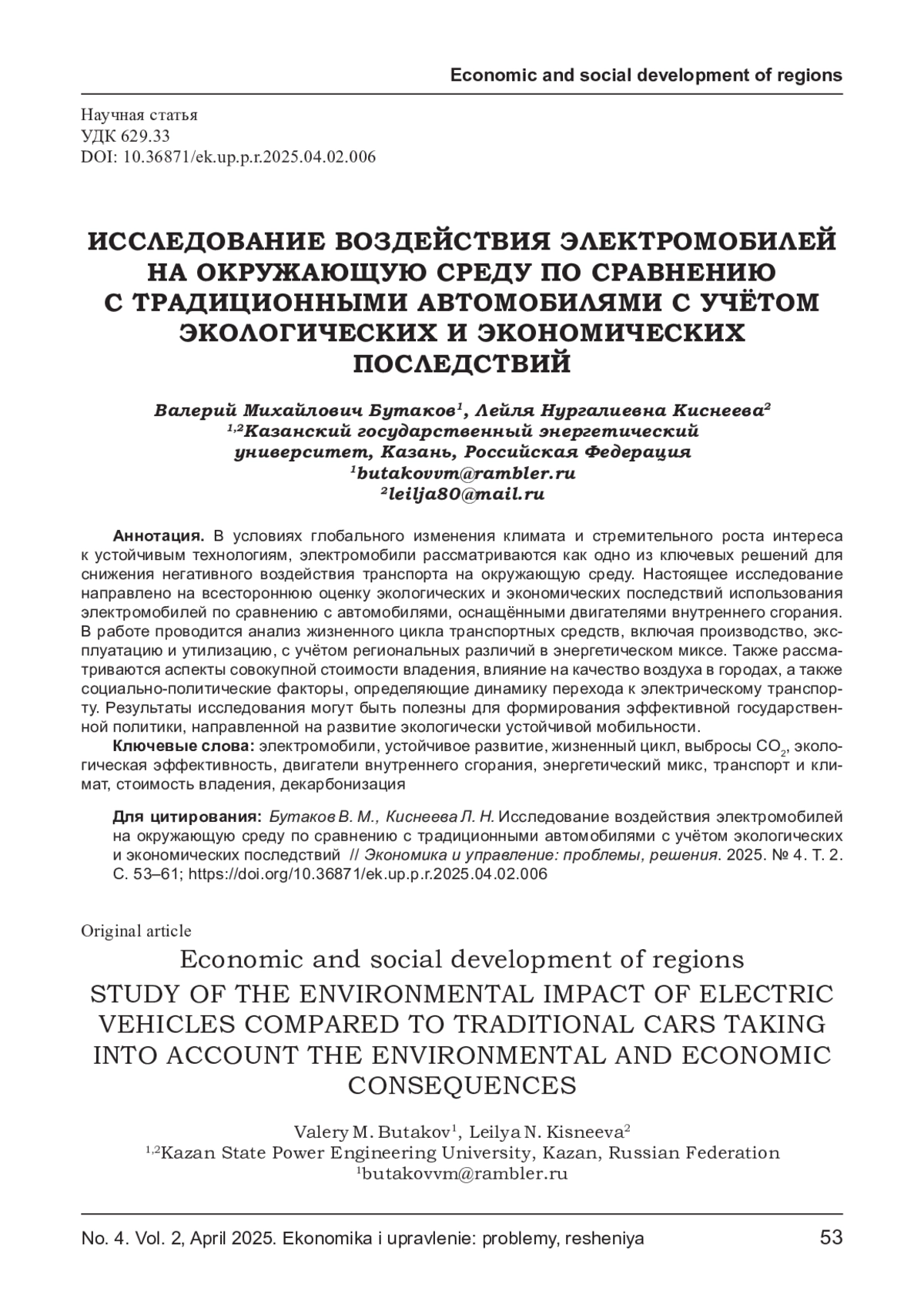 В условиях глобального изменения климата и стремительного роста интереса к устойчивым технологиям, электромобили рассматриваются как одно из ключевых решений для снижения негативного воздействия транспорта на окружающую среду. Настоящее исследование направлено на всестороннюю оценку экологических и экономических последствий использования электромобилей по сравнению с автомобилями, оснащёнными двигателями внутреннего сгорания. В работе проводится анализ жизненного цикла транспортных средств, включая производство, эксплуатацию и утилизацию, с учётом региональных различий в энергетическом миксе. Также рассматриваются аспекты совокупной стоимости владения, влияние на качество воздуха в городах, а также социально - политические факторы, определяющие динамику перехода к электрическому транспорту. Результаты исследования могут быть полезны для формирования эффективной государственной политики, направленной на развитие экологически устойчивой мобильности.