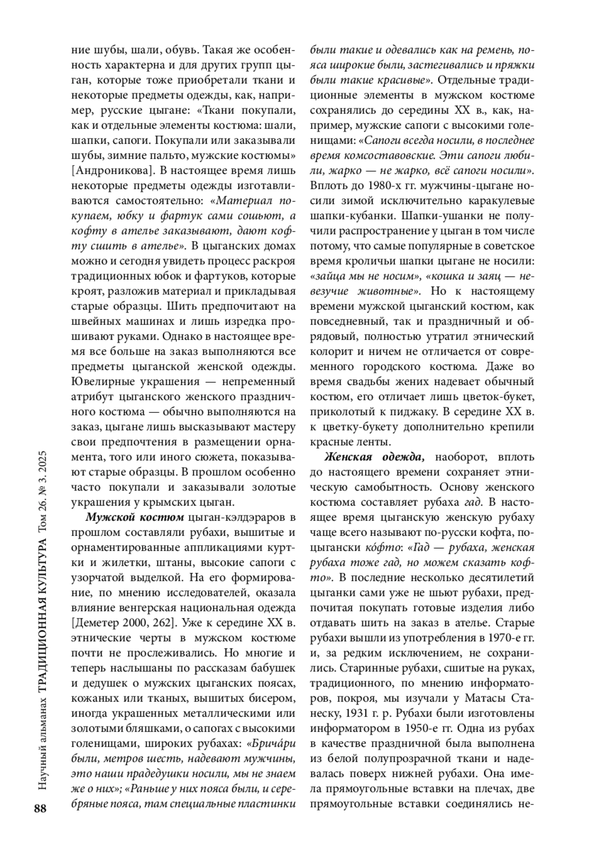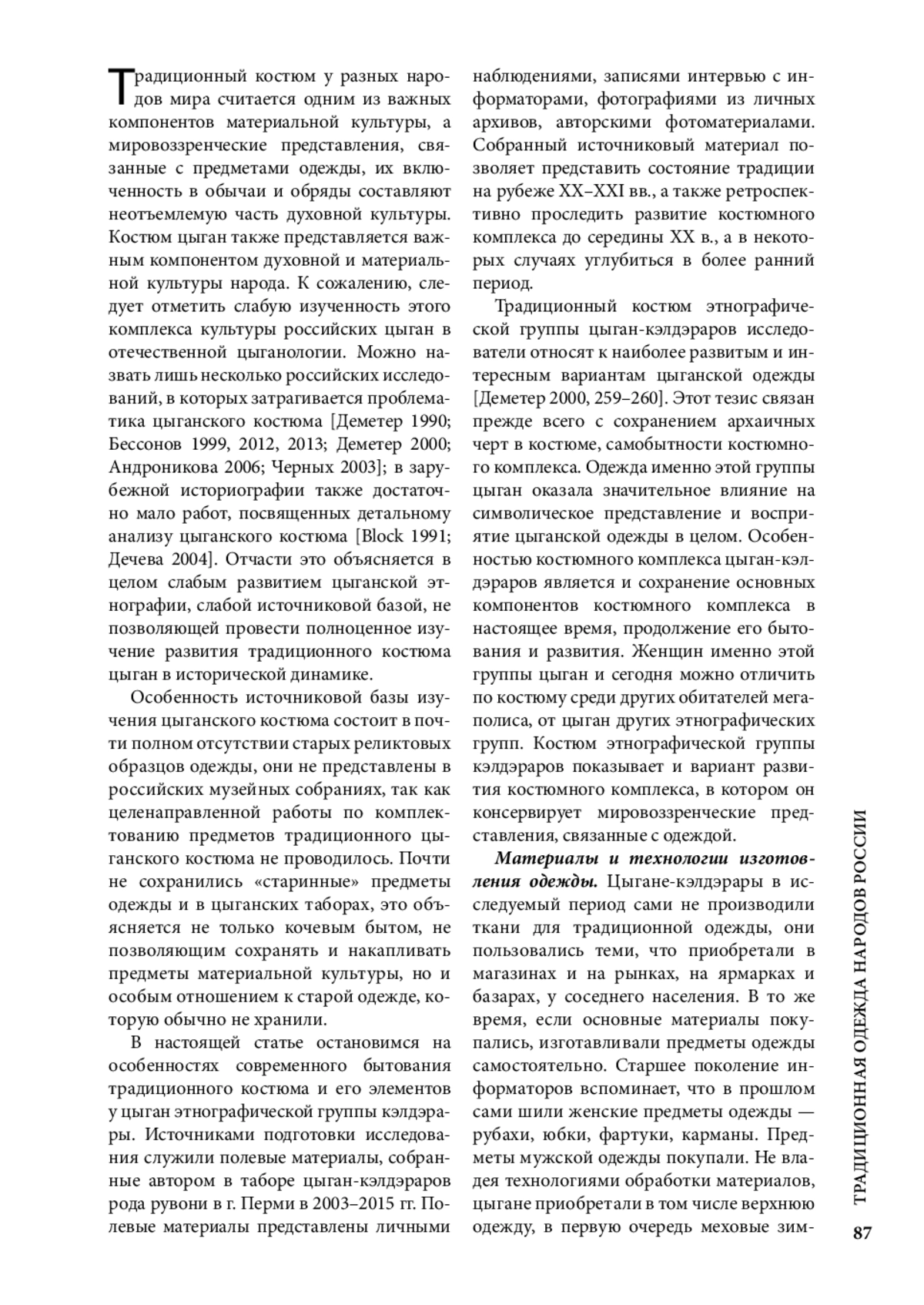 Традиционный костюм у разных народов мира считается одним из важных компонентов материальной культуры, а мировоззренческие представления, связанные с предметами одежды, их включенность в обычаи и обряды составляют неотъемлемую часть духовной культуры. Костюм цыган также представляется важным компонентом духовной и материальной культуры народа. К сожалению, следует отметить слабую изученность этого комплекса культуры российских цыган в отечественной цыганологии. Можно назвать лишь несколько российских исследований, в которых затрагивается проблематика цыганского костюма [Деметер 1990; Бессонов 1999, 2012, 2013; Деметер 2000; Андроникова 2006; Черных 2003]; в зарубежной историографии также достаточно мало работ, посвященных детальному анализу цыганского костюма [Block 1991; Дечева 2004]. Отчасти это объясняется в целом слабым развитием цыганской этнографии, слабой источниковой базой, не позволяющей провести полноценное изучение развития традиционного костюма цыган в исторической динамике.