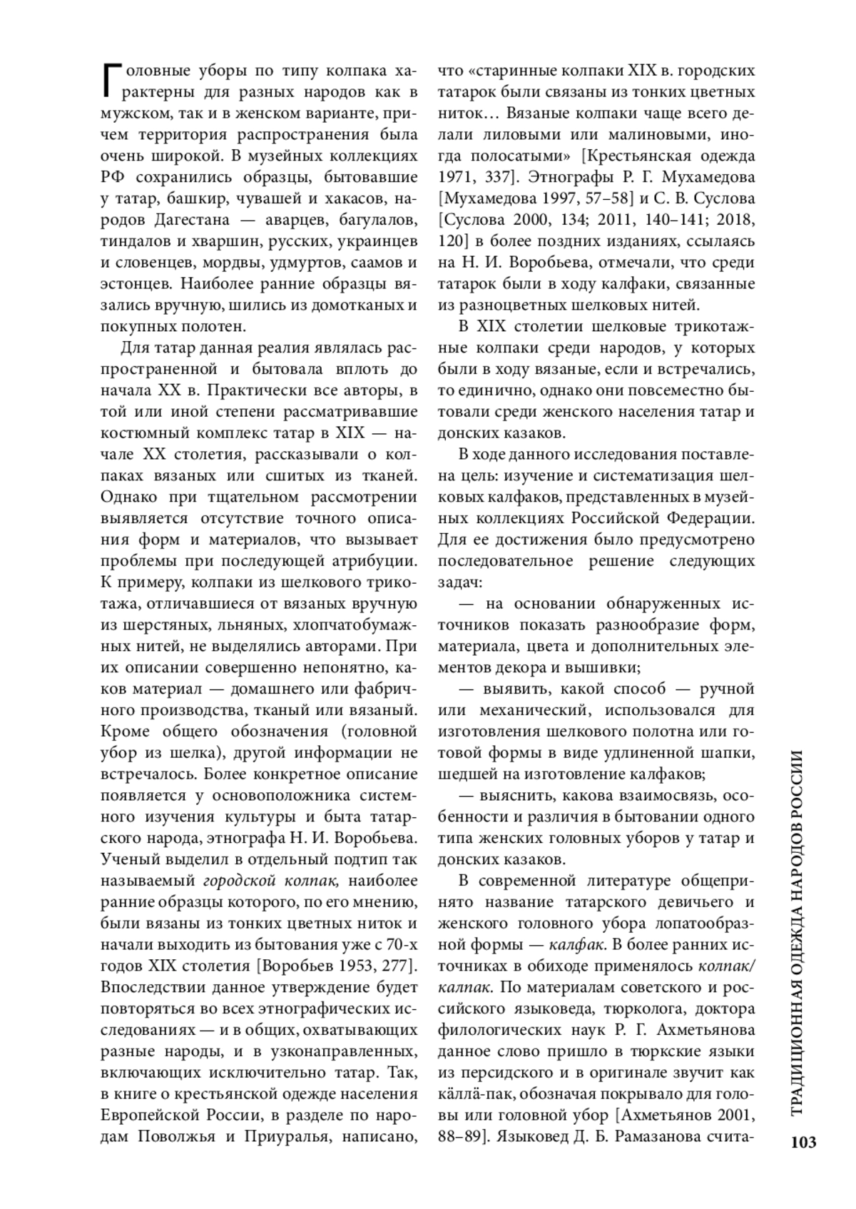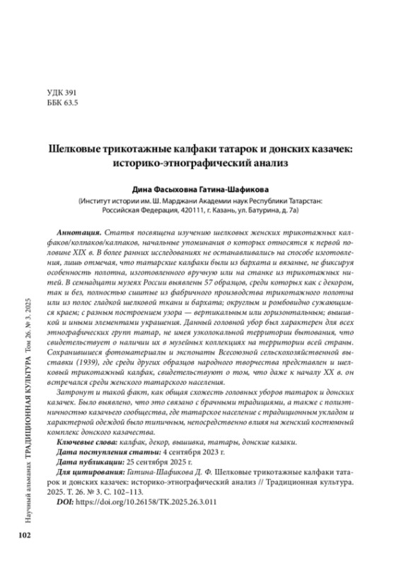 Статья посвящена изучению шелковых женских трикотажных калфаков/колпаков/калпаков, начальные упоминания о которых относятся к первой половине XIX в. В более ранних исследованиях не останавливались на способе изготовления, лишь отмечая, что татарские калфаки были из бархата и вязаные, не фиксируя особенность полотна, изготовленного вручную или на станке из трикотажных нитей. В семнадцати музеях России выявлены 57 образцов, среди которых как с декором, так и без, полностью сшитые из фабричного производства трикотажного полотна или из полос гладкой шелковой ткани и бархата; округлым и ромбовидно сужающимся краем; с разным построением узора — вертикальным или горизонтальным; вышивкой и иными элементами украшения. Данный головной убор был характерен для всех этнографических групп татар, не имея узколокальной территории бытования, что свидетельствует о наличии их в музейных коллекциях на территории всей страны. Сохранившиеся фотоматериалы и экспонаты Всесоюзной сельскохозяйственной выставки (1939), где среди других образцов народного творчества представлен и шелковый трикотажный калфак, свидетельствуют о том, что даже к началу ХХ в. он встречался среди женского татарского населения.