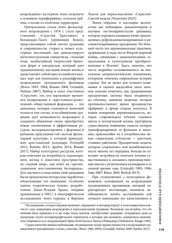 Традиционный религиозный праздник был в центре итальянских этнографических исследований с самого зарождения этноантропологии как академической дисциплины, и по сей день, несмотря на расширение тем антропологических исследований, он остается широко освещаемой темой, особенно в связи с социально-политическими и родословными перспективами. Этот процесс, сопровождаемый отказом от историко-сравнительного метода, привел к существенному обеднению исследований, когда в стороне могут остаться первоначальные и фундаментальные причины, побуждающие сообщества к празднованию, и исторические функции, выполняемые праздником. В статье на конкретных примерах будет предпринята попытка продемонстрировать, что эффективное изучение современных праздничных явлений по-прежнему требует, наряду с полевыми исследованиями и социальным анализом, ссылаться на исторические, сравнительные данные и некоторые феноменологические ориентиры как на методы объяснения религиозных явлений.