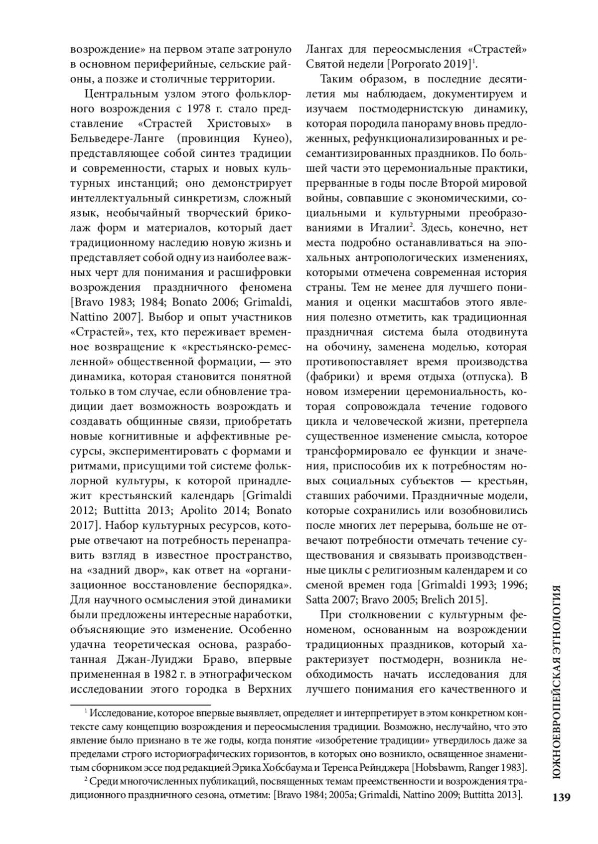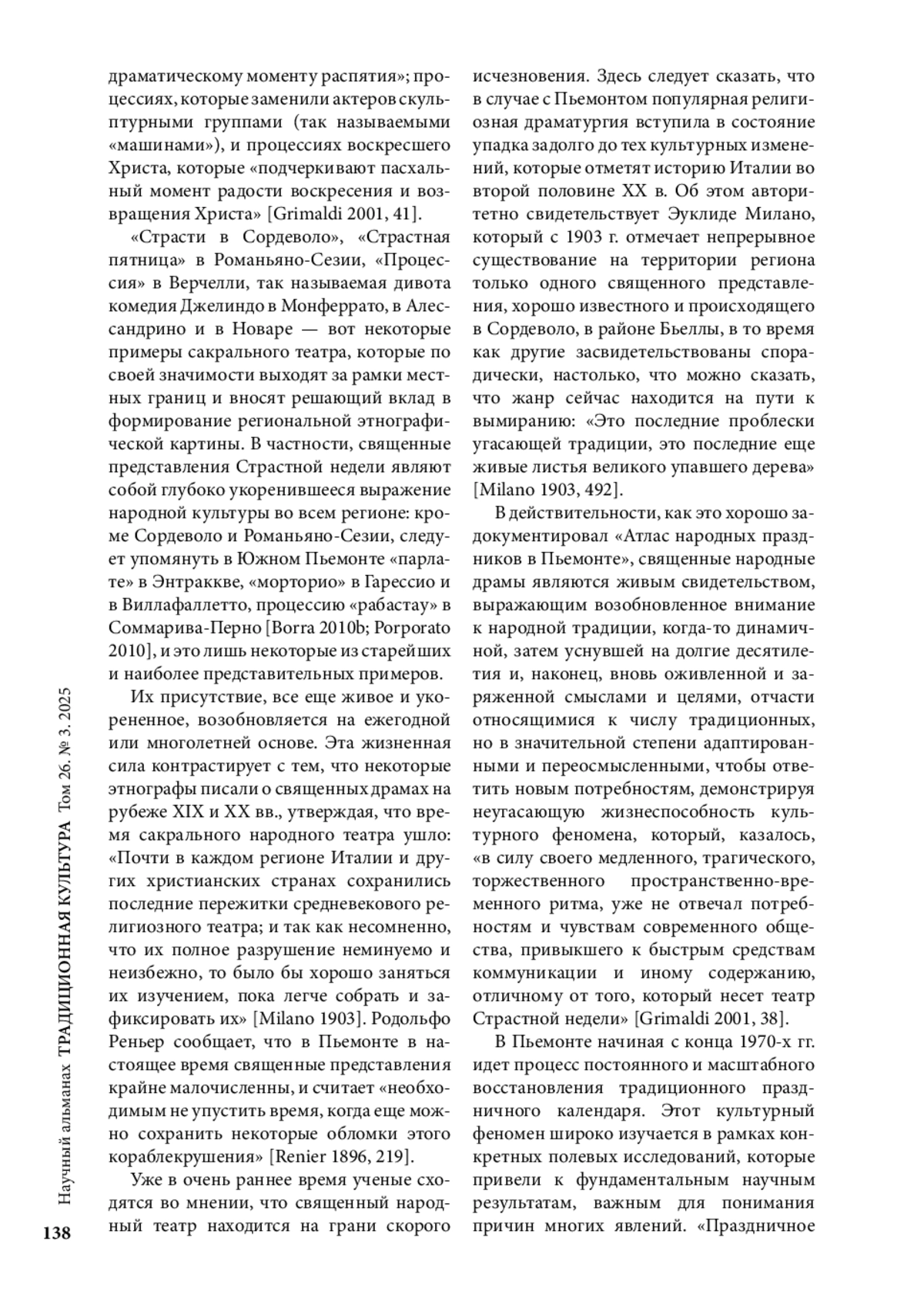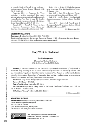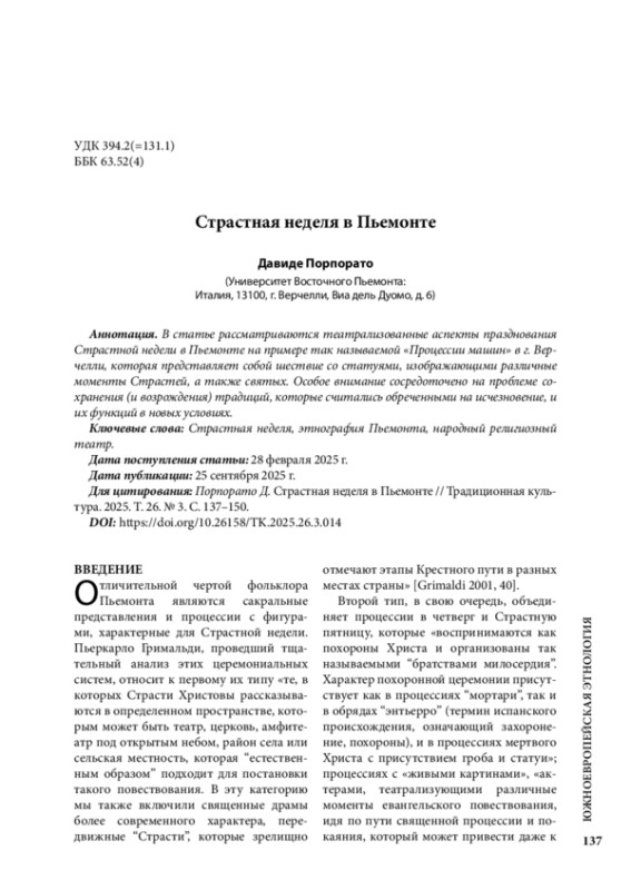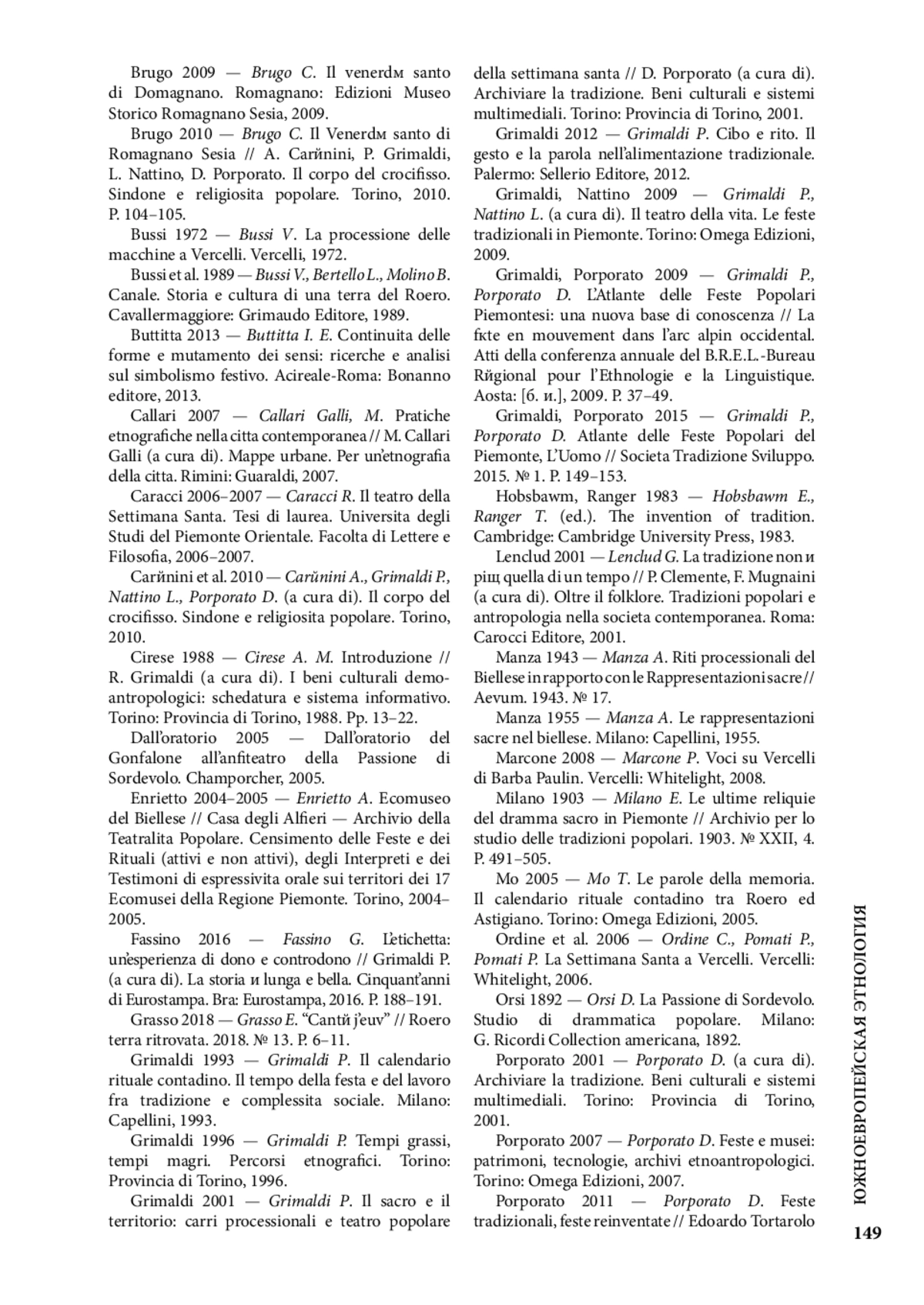 32. Grimaldi P., Porporato D. Atlante delle Feste Popolari del Piemonte, L’Uomo // Societа Tradizione Sviluppo. 2015. № 1. P. 149-153.