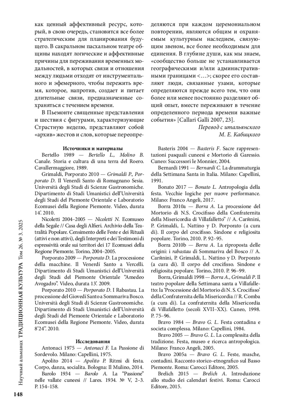 2. Apolito P. Ritmi di festa. Corpo, danza, socialitа. Bologna: Il Mulino, 2014. Barolo 1934 - Barolo A. La “Passione” nelle vallate cuneesi // Lares. 1934. № V, 2-3. P. 154-158.